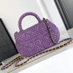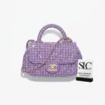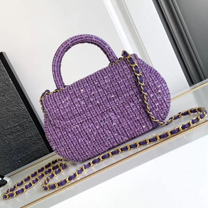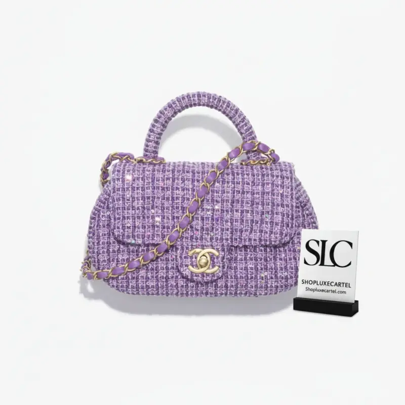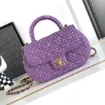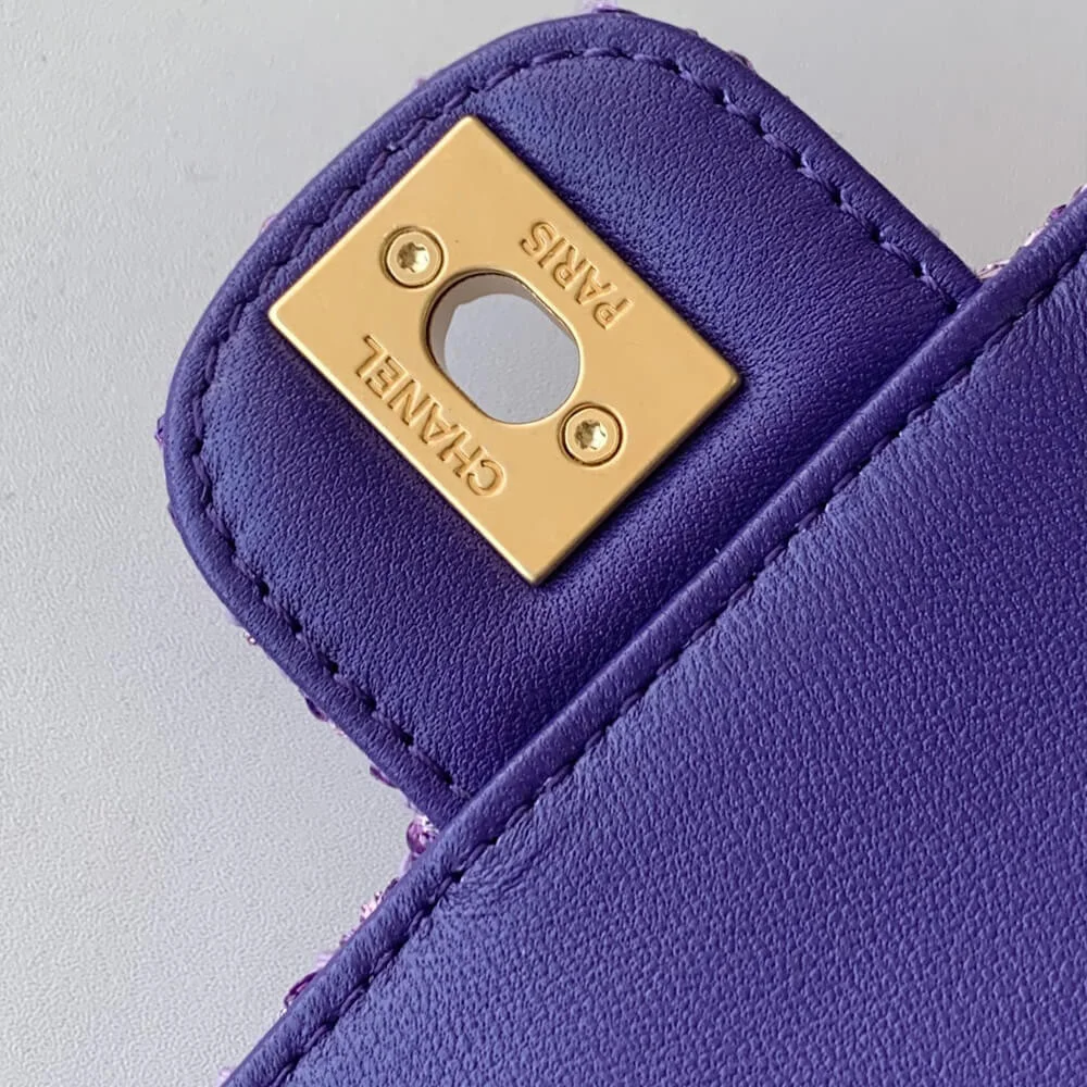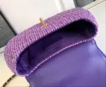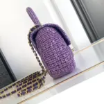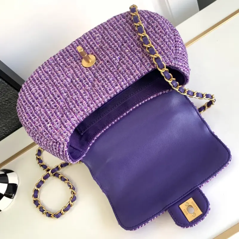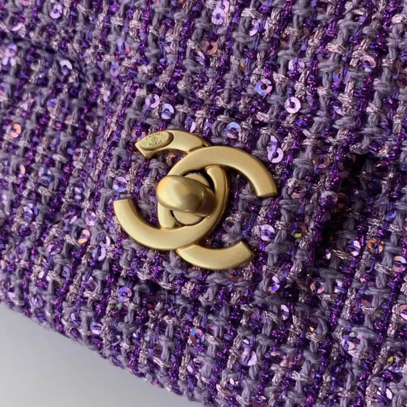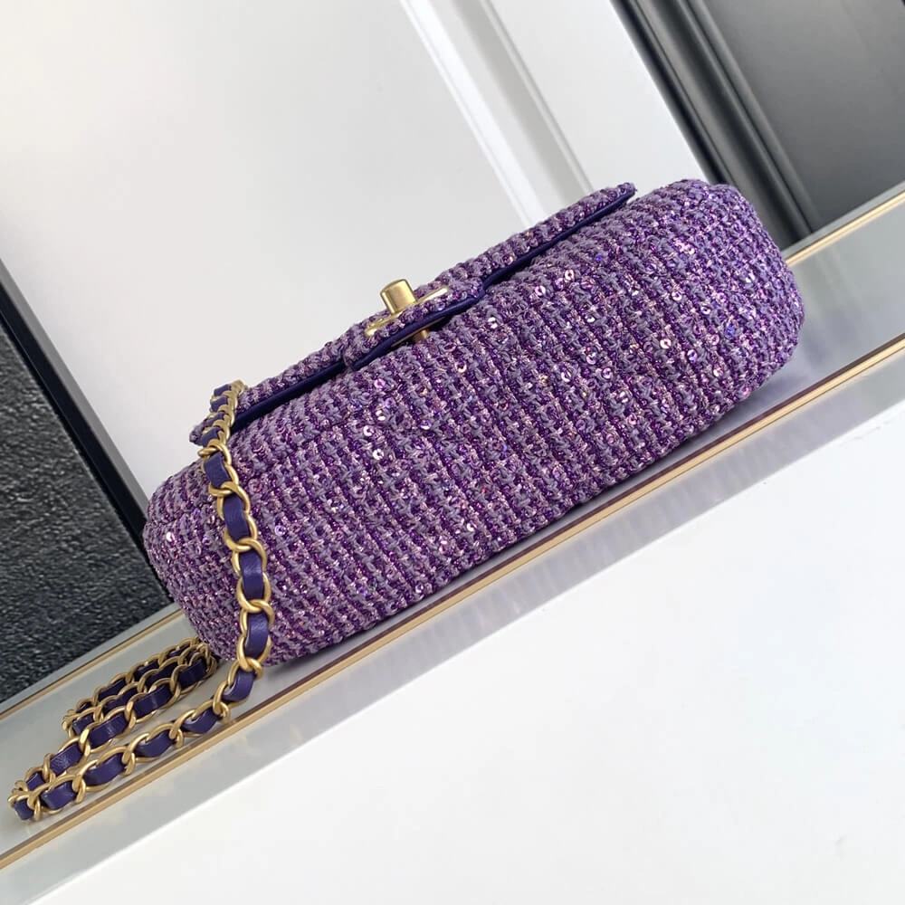 Elevate your accessory collection with this exquisite mini flap bag, meticulously crafted for a standout look. This piece features a captivating purple tweed exterior, beautifully embellished with shimmering sequins that catch the light from every angle. The bag’s structured, rounded silhouette is complemented by elegant antique gold-tone hardware, offering a timeless and sophisticated appeal.