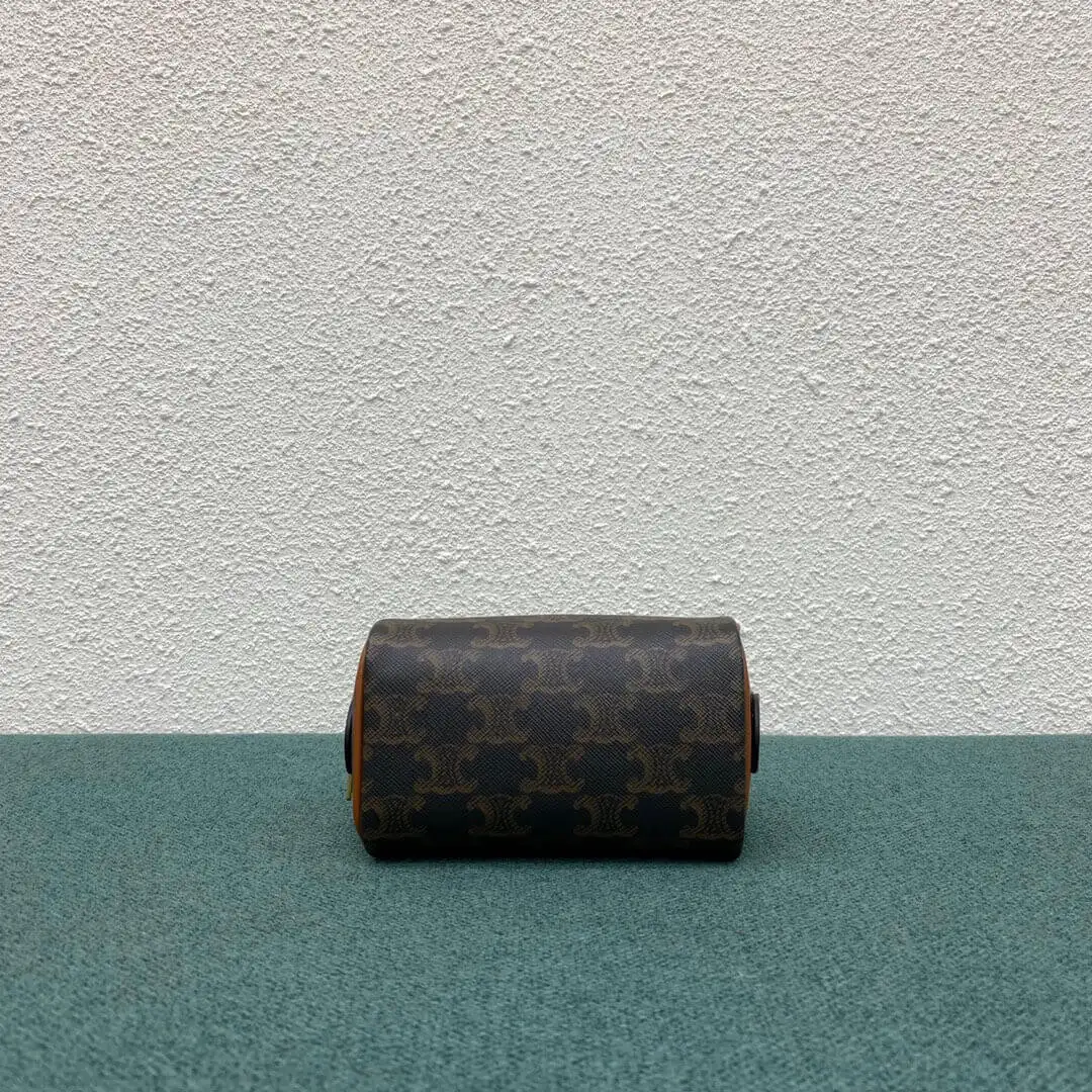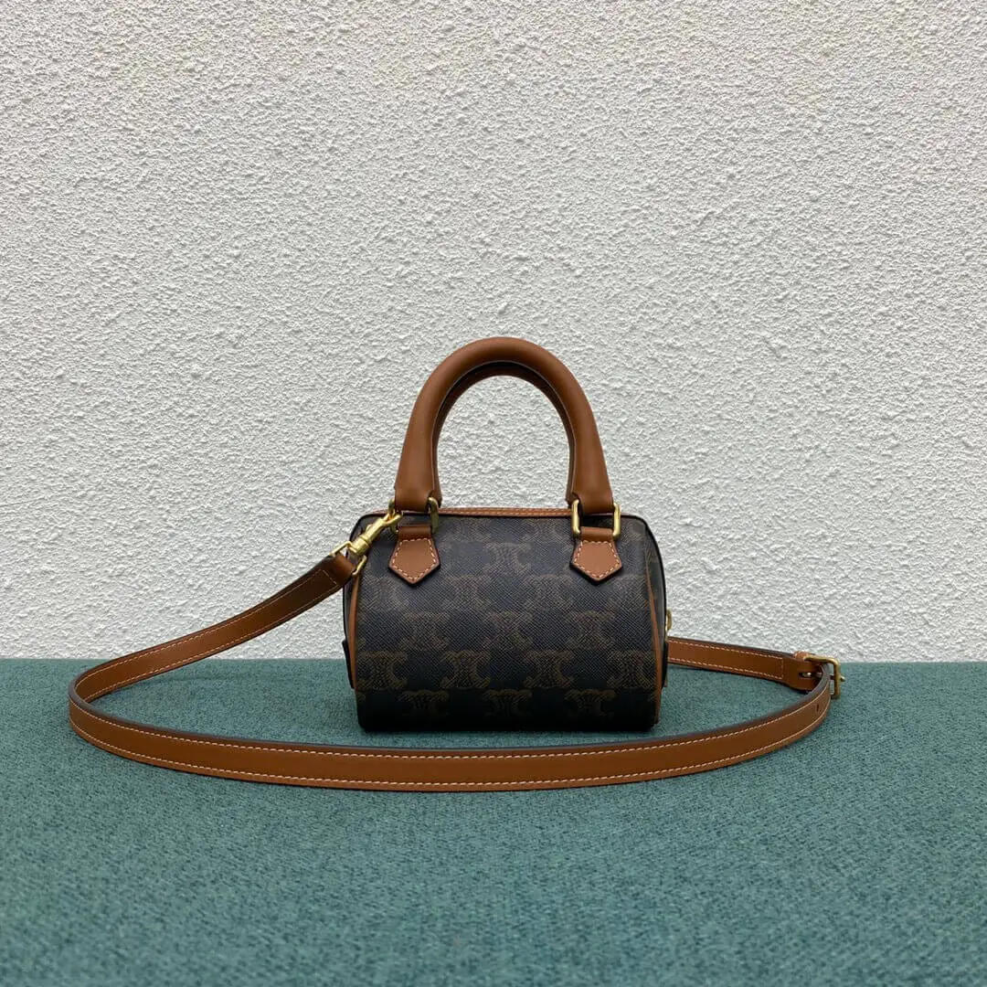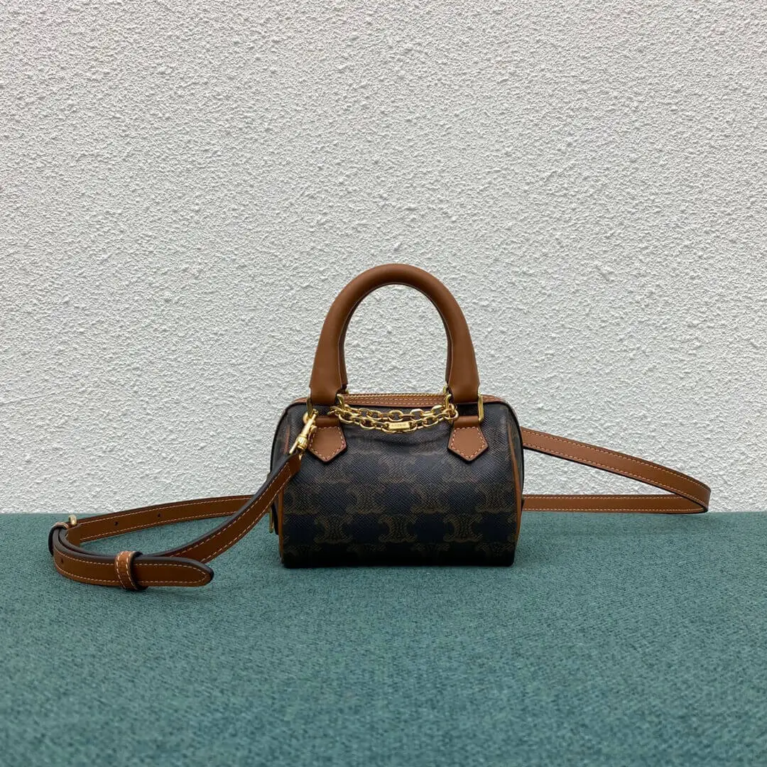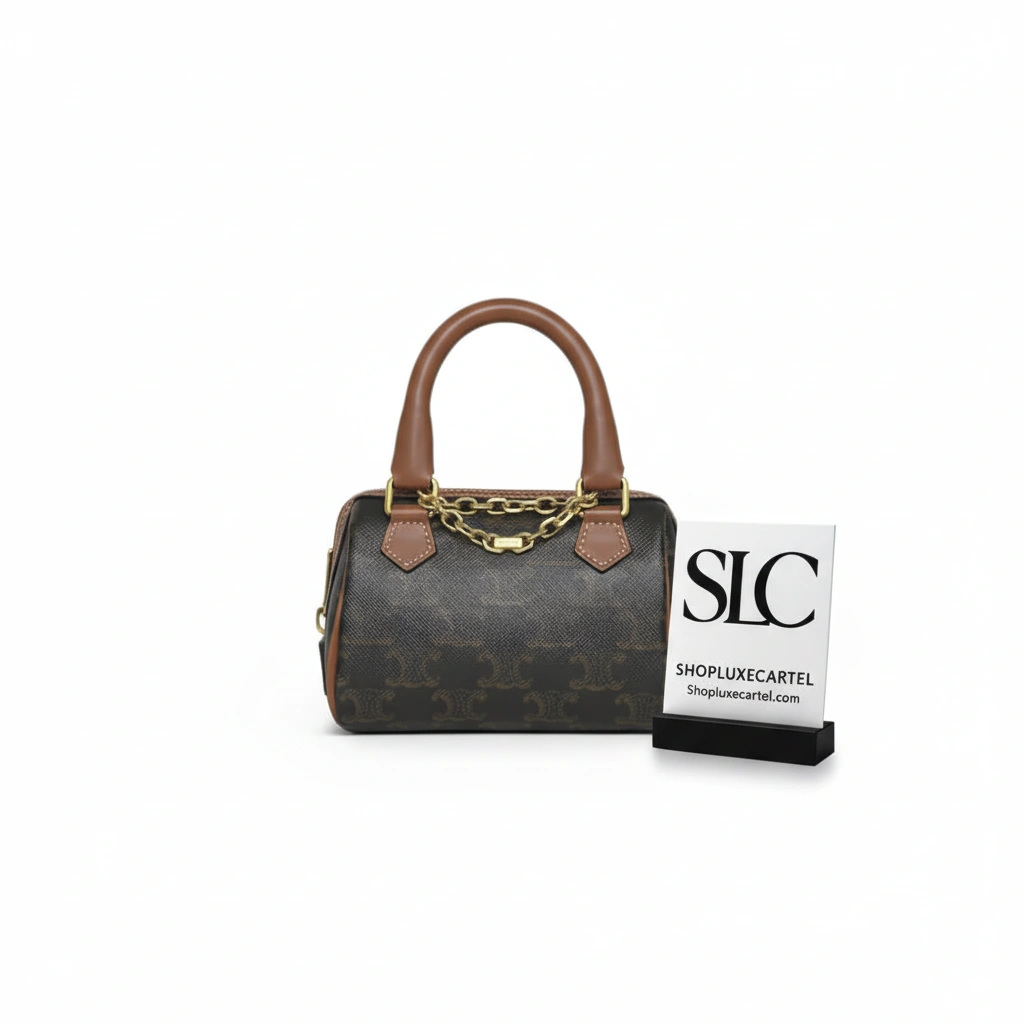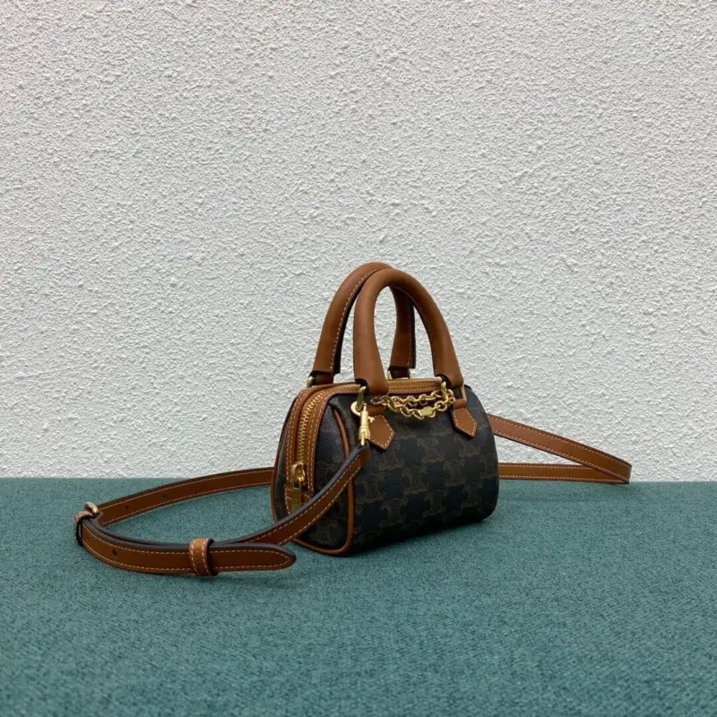 Discover a timeless silhouette with this beautifully crafted mini Boston bag. Its compact, structured design is perfect for both everyday elegance and special occasions. The bag is fashioned from a durable coated canvas, featuring a sophisticated triumphal arch-inspired print, and is elegantly trimmed with genuine calfskin leather. Polished gold-tone hardware adds a touch of refined luxury to the overall design.