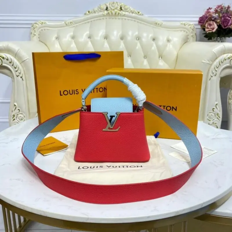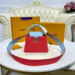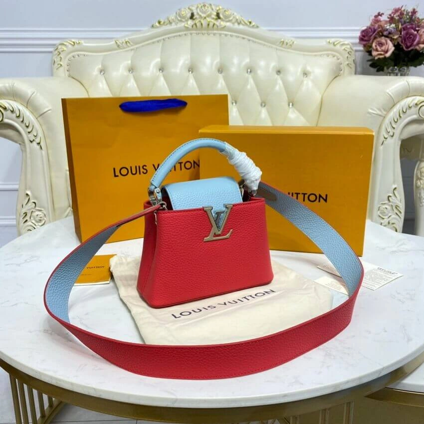 Expertly crafted from richly grained calfskin leather, this mini top handle bag showcases a sophisticated colorblock design. The elegant flap and single top handle feature a complementary hue that beautifully contrasts with the body of the bag, creating a modern and polished look. A wide, removable strap offers a comfortable crossbody or shoulder carry option, making it a versatile choice for any occasion.