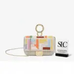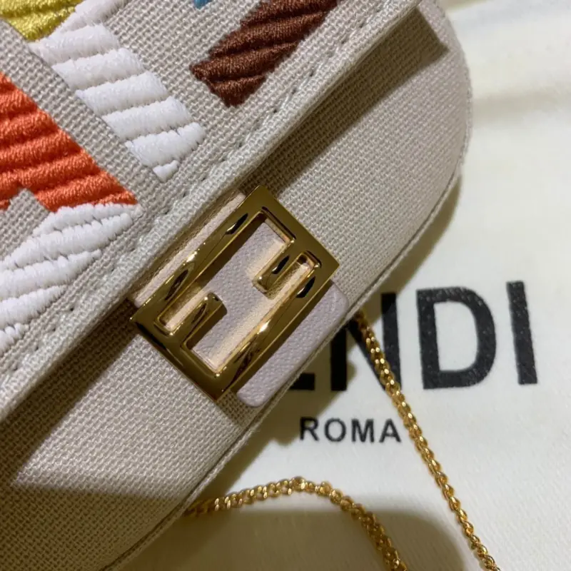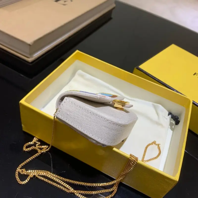 Discover the perfect miniature accessory with this chic and versatile bag charm. Crafted from durable beige canvas, this piece features a sophisticated all-over geometric motif embroidered in a delightful array of colors. Its classic, structured silhouette is complemented by gleaming gold-finish hardware, making it an elegant addition to any collection.