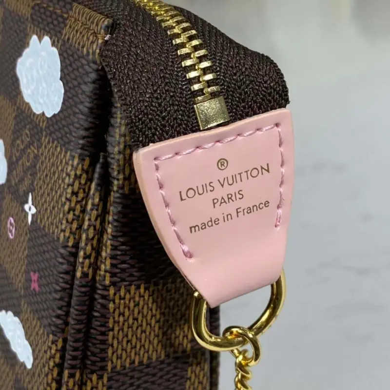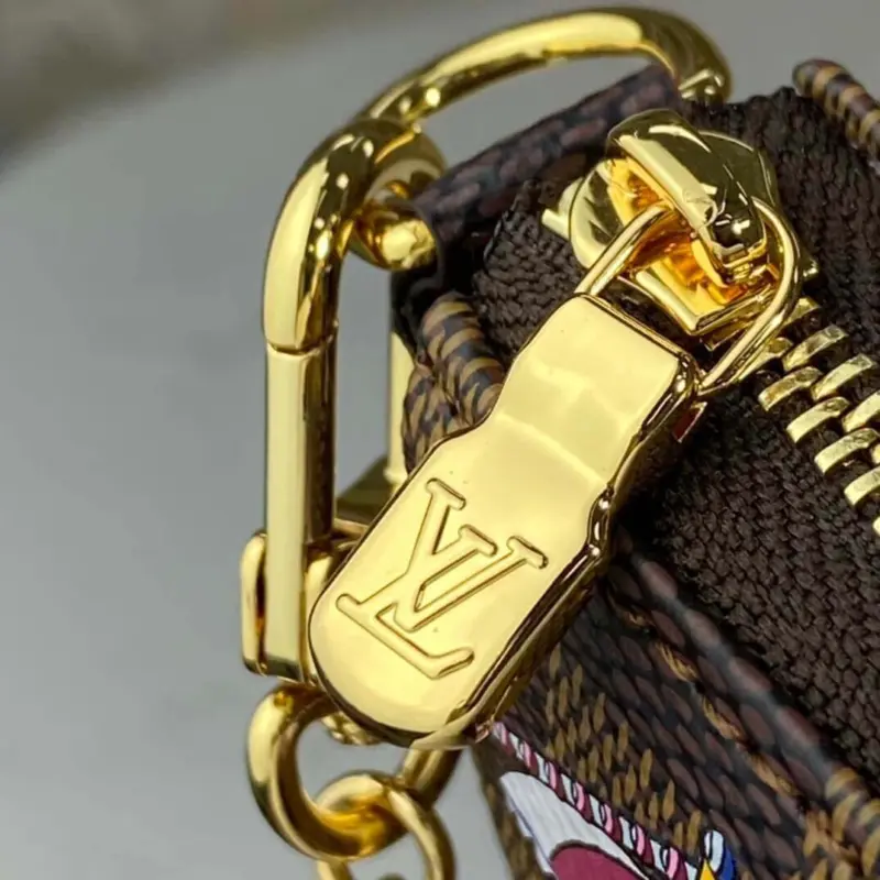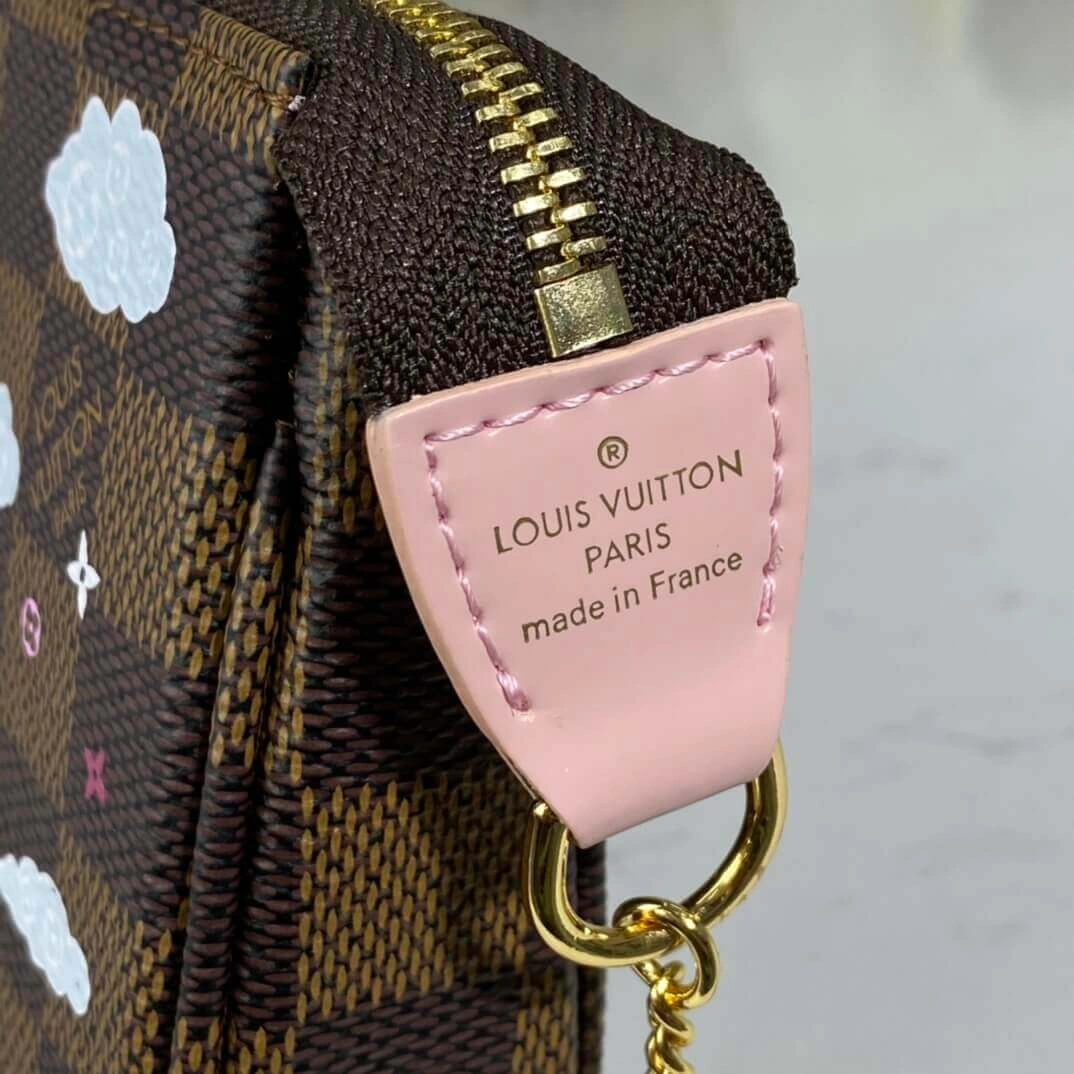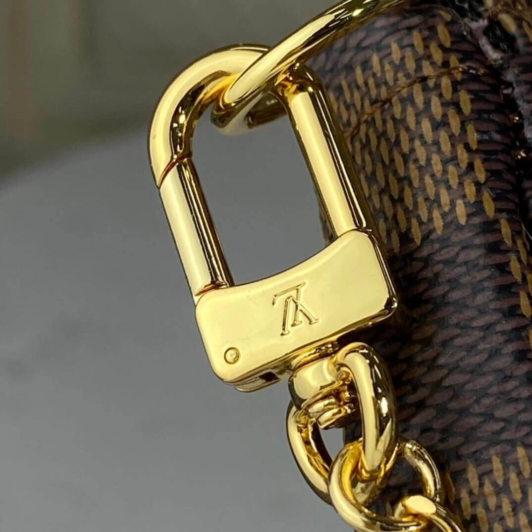 Crafted from durable coated canvas in a timeless checkerboard pattern, this pouch is built for both style and longevity. It features a secure zip closure and a non-removable, gold-tone chain with a hook, allowing it to be conveniently attached to a belt or bag for versatile wear.