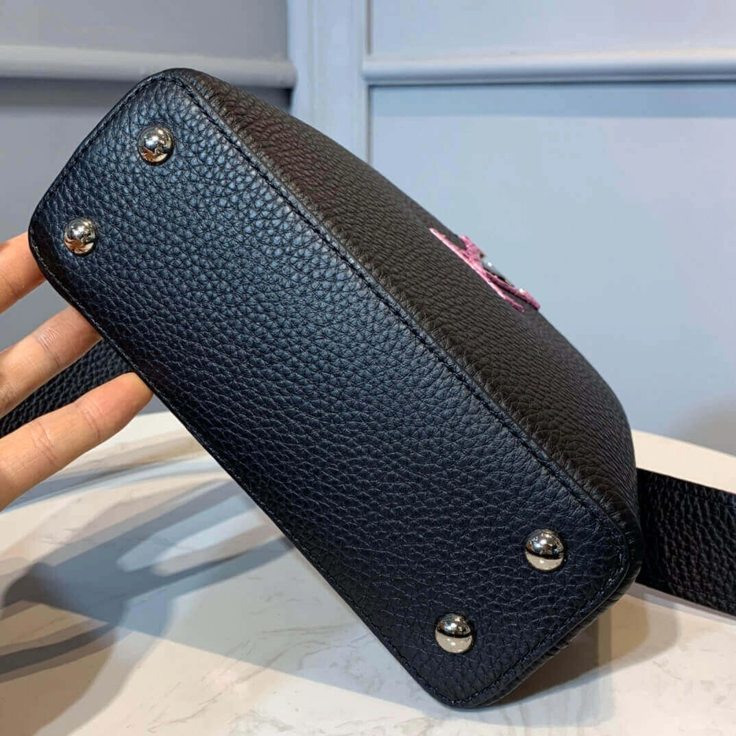 A wide, detachable strap enhances the bag’s modern edge, offering the flexibility of shoulder or cross-body styling. The thoughtfully designed interior and protective bottom studs combine practicality with high-end appeal, creating a truly versatile and chic piece.