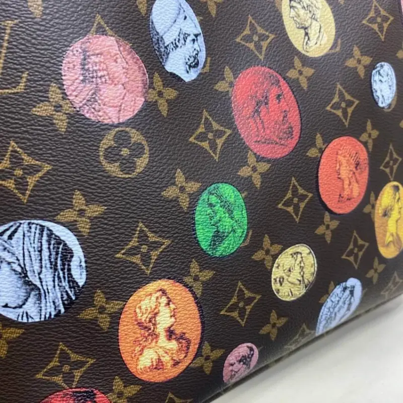 Discover a timeless and spacious tote, distinguished by a unique artistic print. This bag features an elegant overlay of colorful cameos, inspired by antique coins and classical Greco-Roman motifs, set against a classic geometric emblem canvas. Its sophisticated design offers a versatile accessory perfect for elevating any wardrobe with a touch of historical artistry.