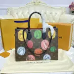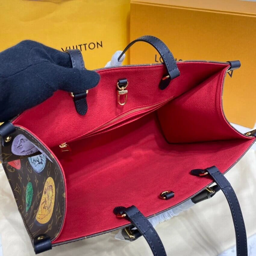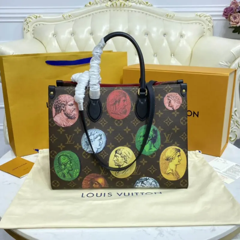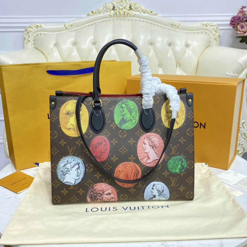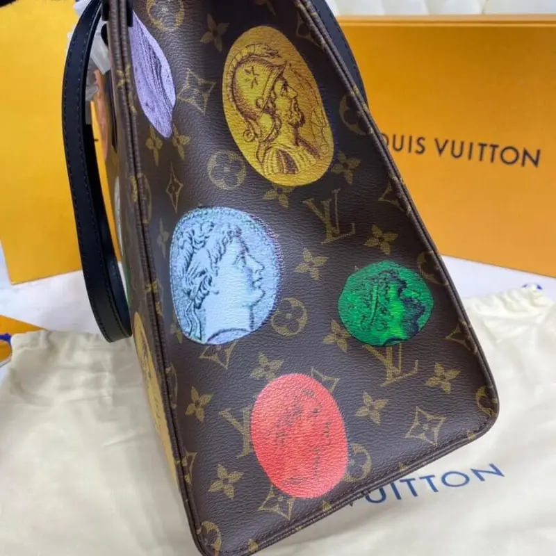 This versatile tote bag showcases an artistic and exclusive print that beautifully overlays vibrantly colored cameos on a classic monogram canvas. The design draws inspiration from antique coins, creating a unique and sophisticated look. Stylish and practical, this spacious carryall is perfect for daily use or travel, making it a standout addition to any collection.