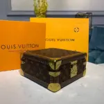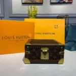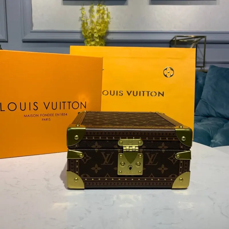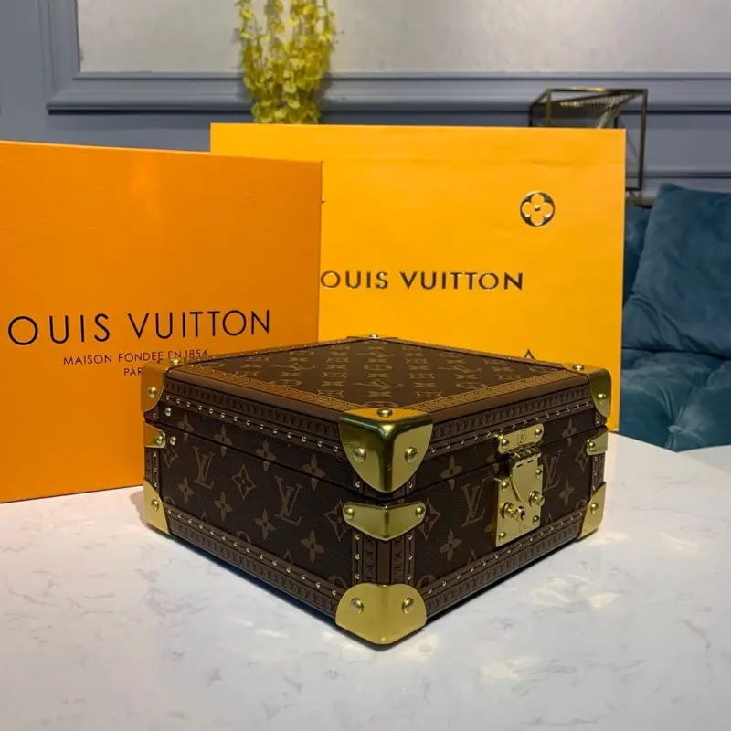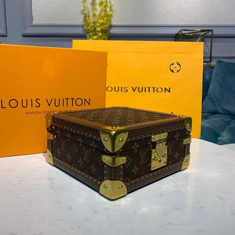 Crafted from a durable coated canvas showcasing a classic geometric pattern, this case is built to last. The exterior is reinforced with sturdy trim, decorative nail heads, and polished golden-toned brass corners for added protection and a touch of sophistication. A secure metallic S-lock closure keeps your collection safe, making it the perfect blend of style and function.