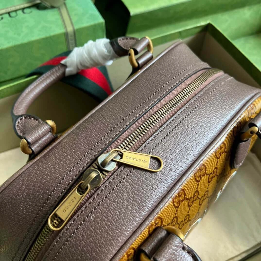 Discover a perfect blend of vintage-inspired style and modern functionality with this compact duffle bag. Crafted from a durable coated canvas featuring a sophisticated geometric monogram print, this bag is accented with rich brown leather trim and a signature striped webbing detail in classic green and red. The design evokes a timeless sportswear aesthetic, making it a versatile accessory for any occasion.