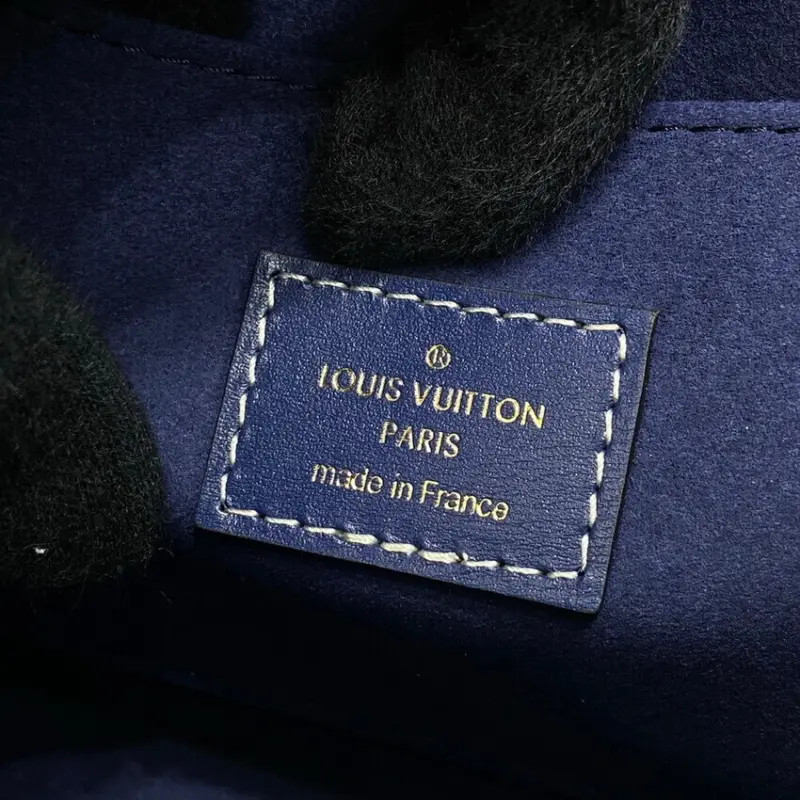 This beautifully structured shoulder bag presents a timeless, vintage-inspired silhouette, crafted from a durable denim jacquard textile. The design showcases a classic all-over monogram print, elegantly framed by smooth navy-blue calfskin leather trim for a refined and polished finish.