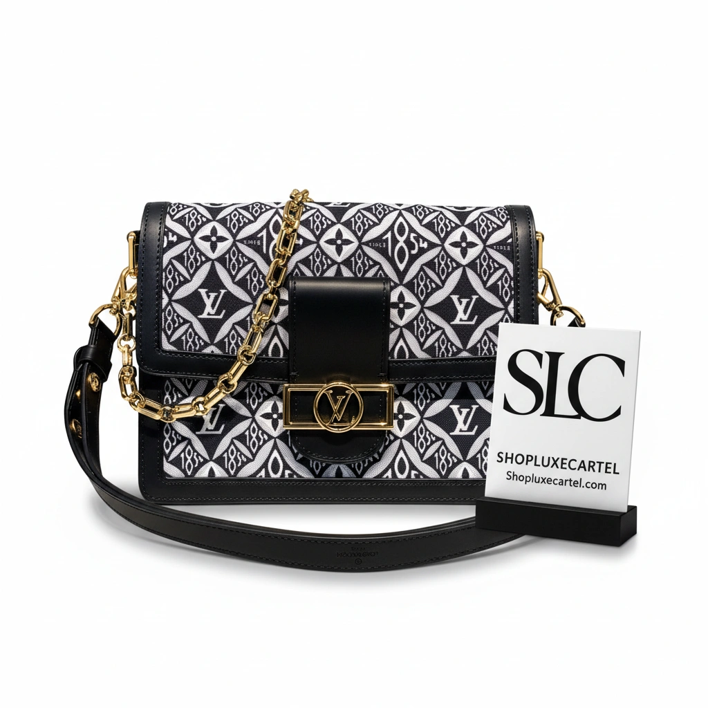 - Primary Material: Jacquard denim with a geometric monogram pattern