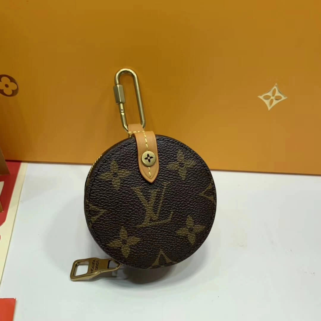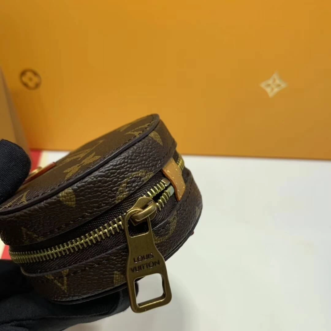 This compact and stylish round case is the perfect accessory for organizing small essentials on the go. Crafted from a durable coated canvas featuring a classic monogram print, it offers both elegance and practicality. The genuine cowhide leather trim and aged-gold hardware add a touch of timeless sophistication to its design.