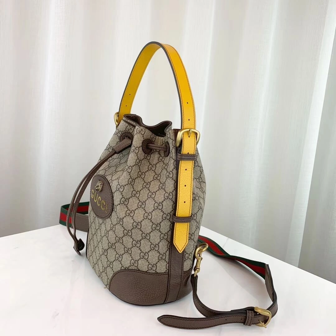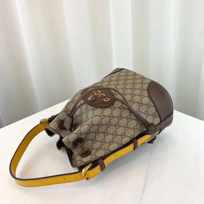 The bucket-style silhouette is secured with a leather drawstring closure, providing easy access to the spacious, cotton-lined interior. Inside, you’ll find dedicated pockets for your smartphone and other essentials to keep you organized on the go. The design is completed with handsome brass hardware, a distinctive contrasting yellow leather top handle, and a decorative oval leather tag featuring a feline head emblem.