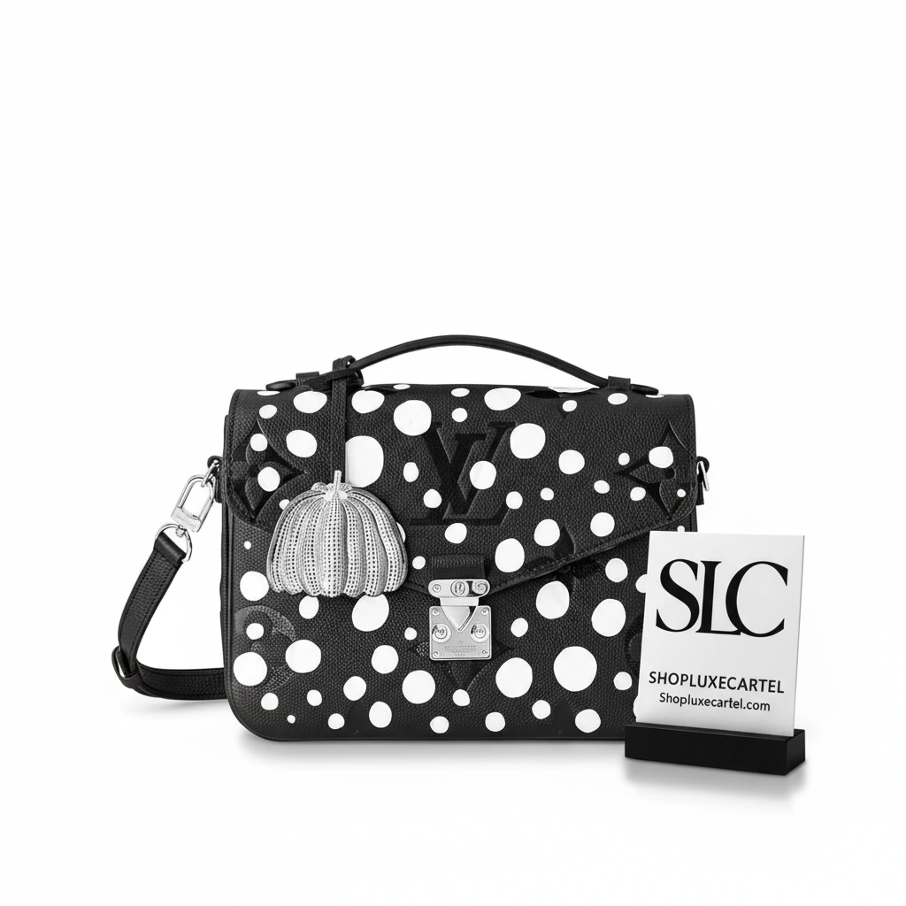 The striking black and white design is elegantly accented with polished silver-tone hardware and a secure push-lock closure. For superior organization, the interior is thoughtfully designed with three separate compartments and a flat pocket, supplemented by a convenient zipped pocket on the exterior. A removable, whimsical pumpkin-shaped charm adds a final touch of personality to this distinguished accessory.