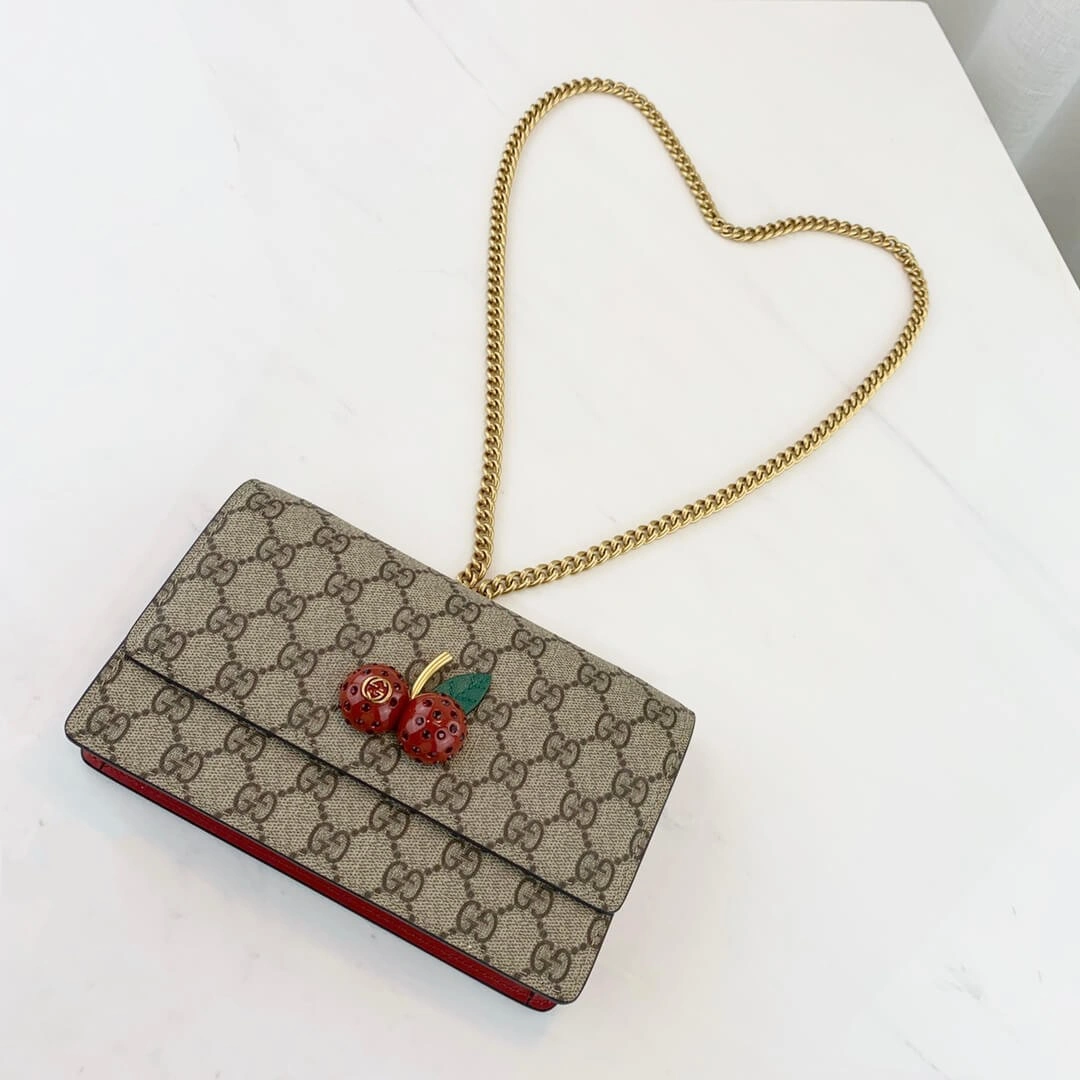 The design is brought to life by a whimsical, three-dimensional cherry accessory, beautifully adorned with sparkling crystals that catch the light. Complemented by antique gold-toned hardware and a classic chain strap, this bag offers both elegance and a touch of modern fun. The interior is lined with a soft, suede-like microfiber, ensuring your belongings are kept secure and protected.