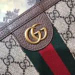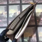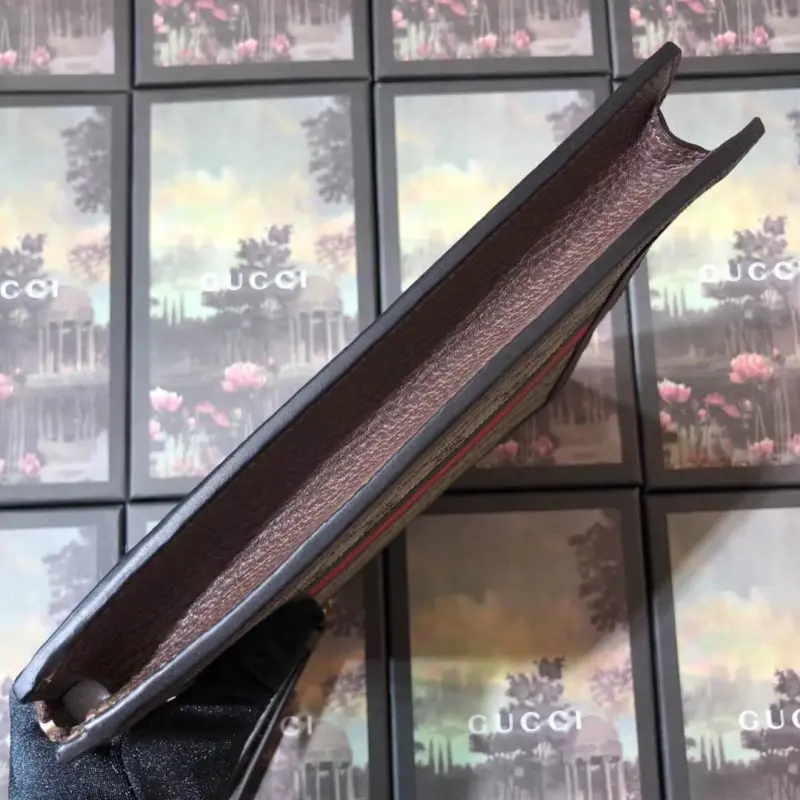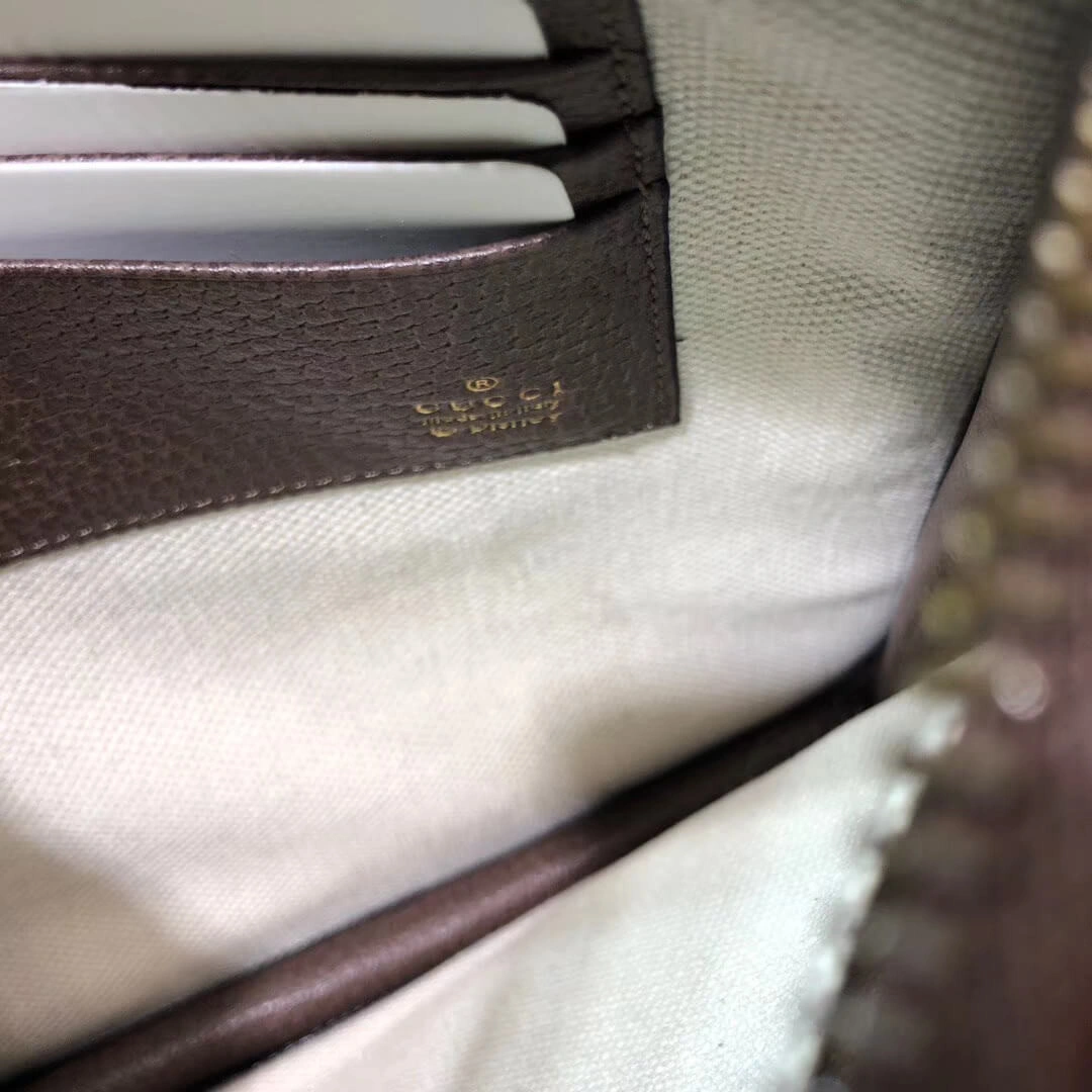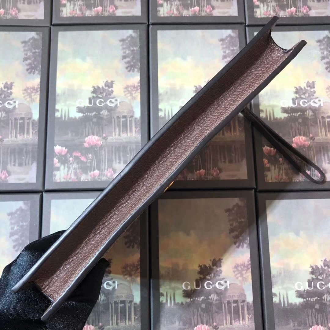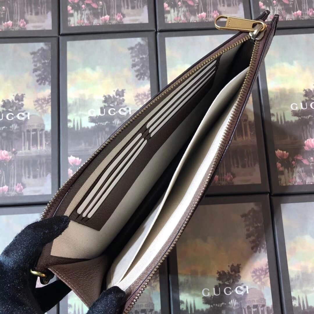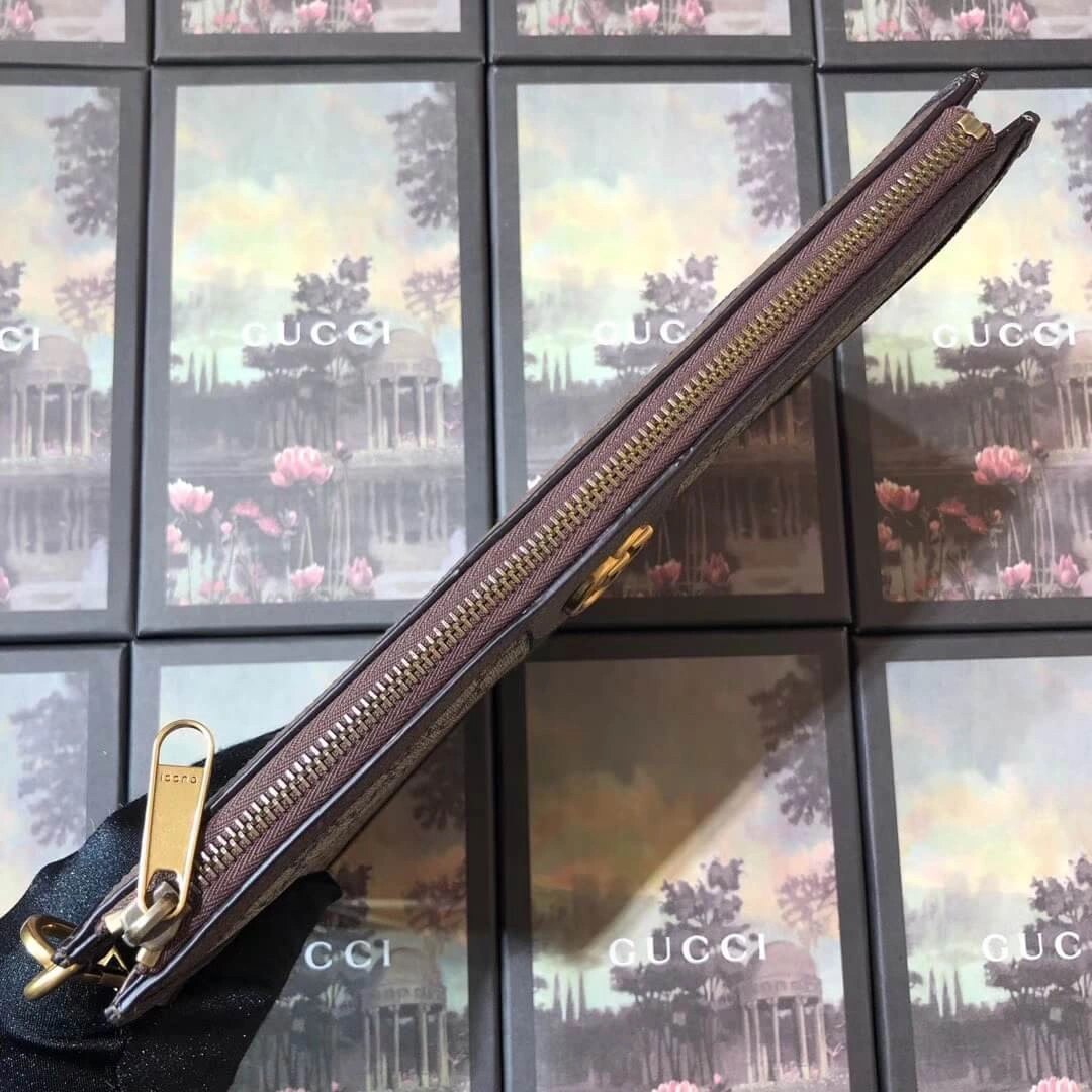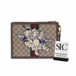 The design is distinguished by a whimsical embroidered patch of a cartoon pig, adding a touch of unexpected character. A signature green and red stripe detail provides a classic, recognizable finish. The secure top zipper opens to a finely crafted interior with multiple card slots and a pocket, ensuring your essentials are always within reach.