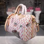 Discover a truly unique take on a timeless travel bag silhouette. This Boston-style satchel is crafted from a durable coated canvas, featuring a classic monogram print playfully updated with a charming all-over animal illustration. The whimsical design, combined with natural cowhide leather trim and gleaming gold-tone hardware, creates a sophisticated yet lighthearted accessory perfect for daily use and travel.
