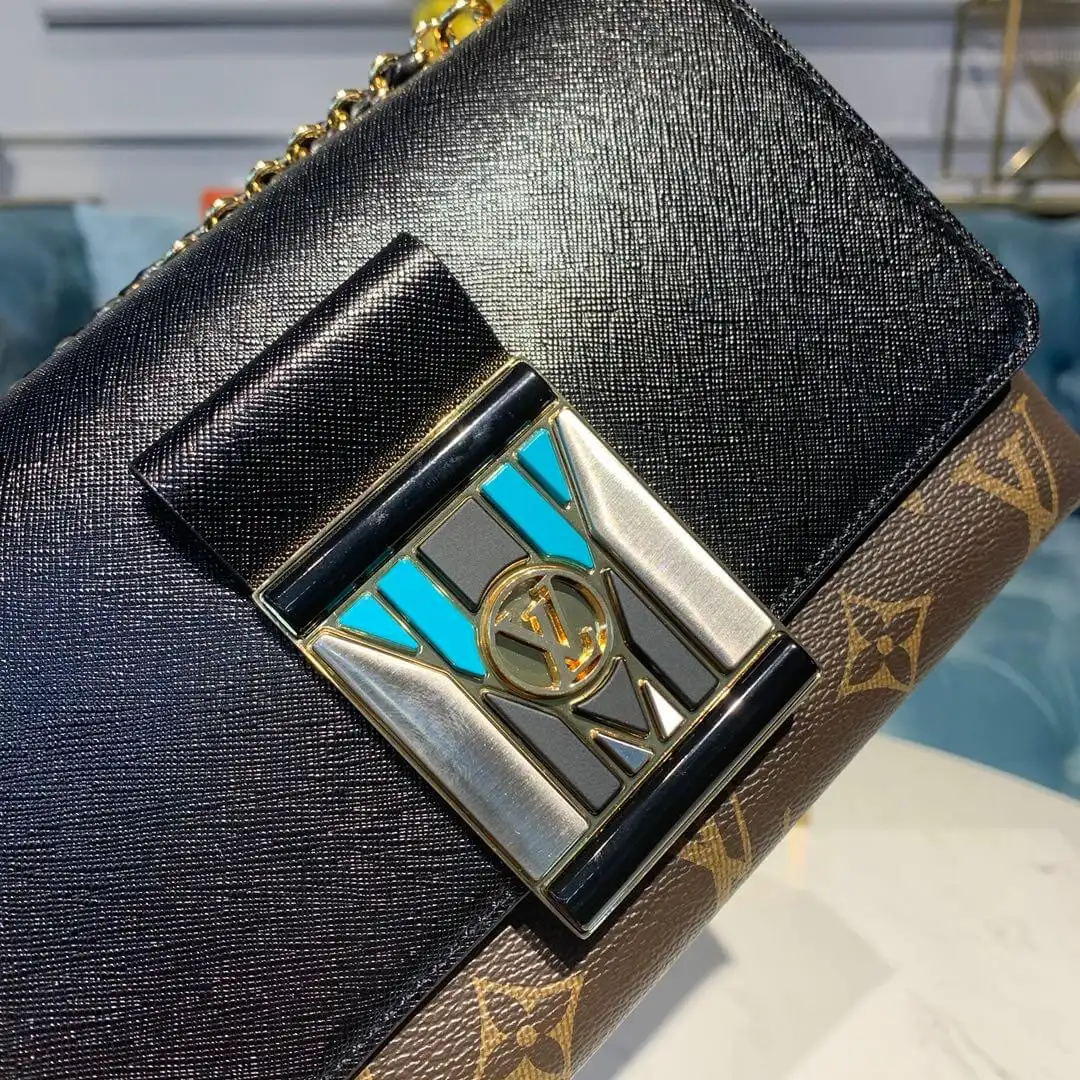 This elegant pochette is a study in sophisticated contrasts, pairing rich black grained leather with a classic monogram-print canvas. Its design is centered around a striking, Art Deco-inspired gold-tone lock that serves as a decorative centerpiece. Perfectly sized for essentials, this bag transitions seamlessly from a daytime accessory to an evening clutch, making it a versatile addition to any wardrobe.