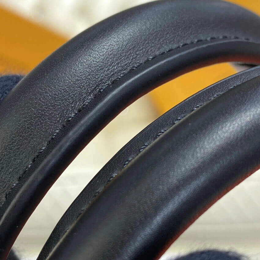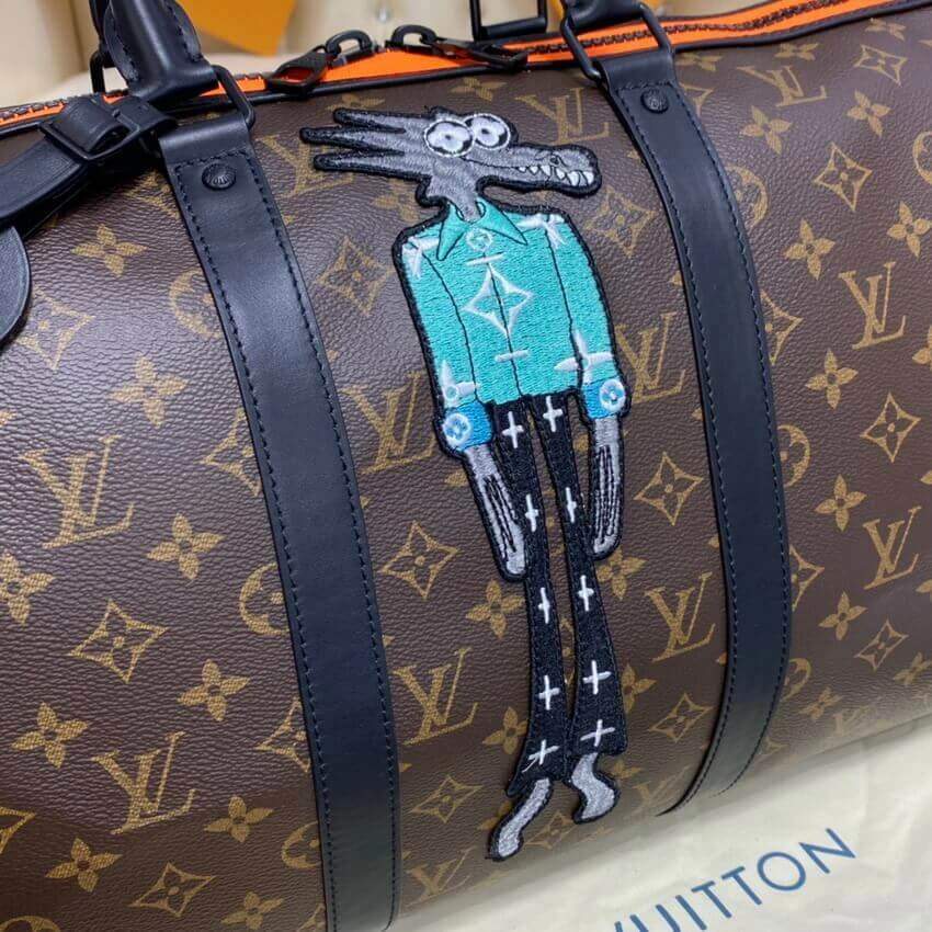 This travel duffle bag brings a touch of playful charm to a classic design, featuring a unique embroidered patch of a whimsical cartoon character. Crafted from durable coated canvas adorned with a timeless monogram print, it is elegantly accented with smooth, matte-black leather trim. A vibrant orange lining inside the zipper adds an unexpected pop of color, making this bag a standout piece for any journey.