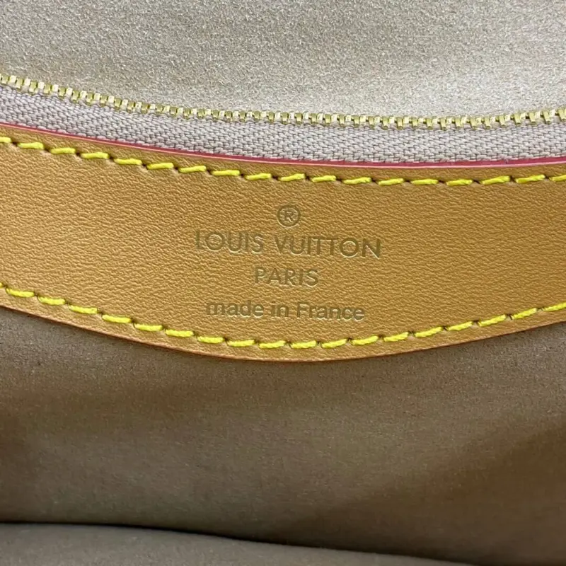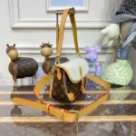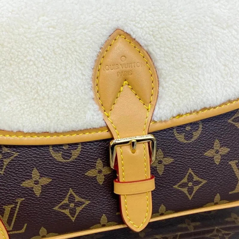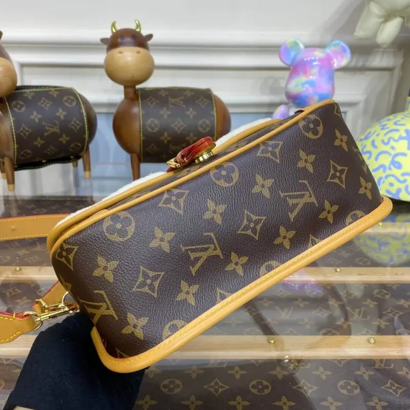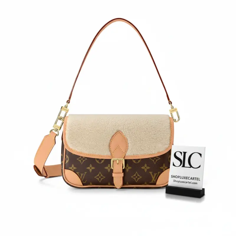Discover a perfect blend of classic design and cozy sophistication with this beautifully crafted shoulder bag. The exterior features a timeless monogram print on durable coated canvas, elegantly contrasted with soft, cream-hued shearling for a touch of warmth and texture. Finished with natural cowhide leather trim and gleaming gold-tone hardware, this bag offers a polished and versatile look.