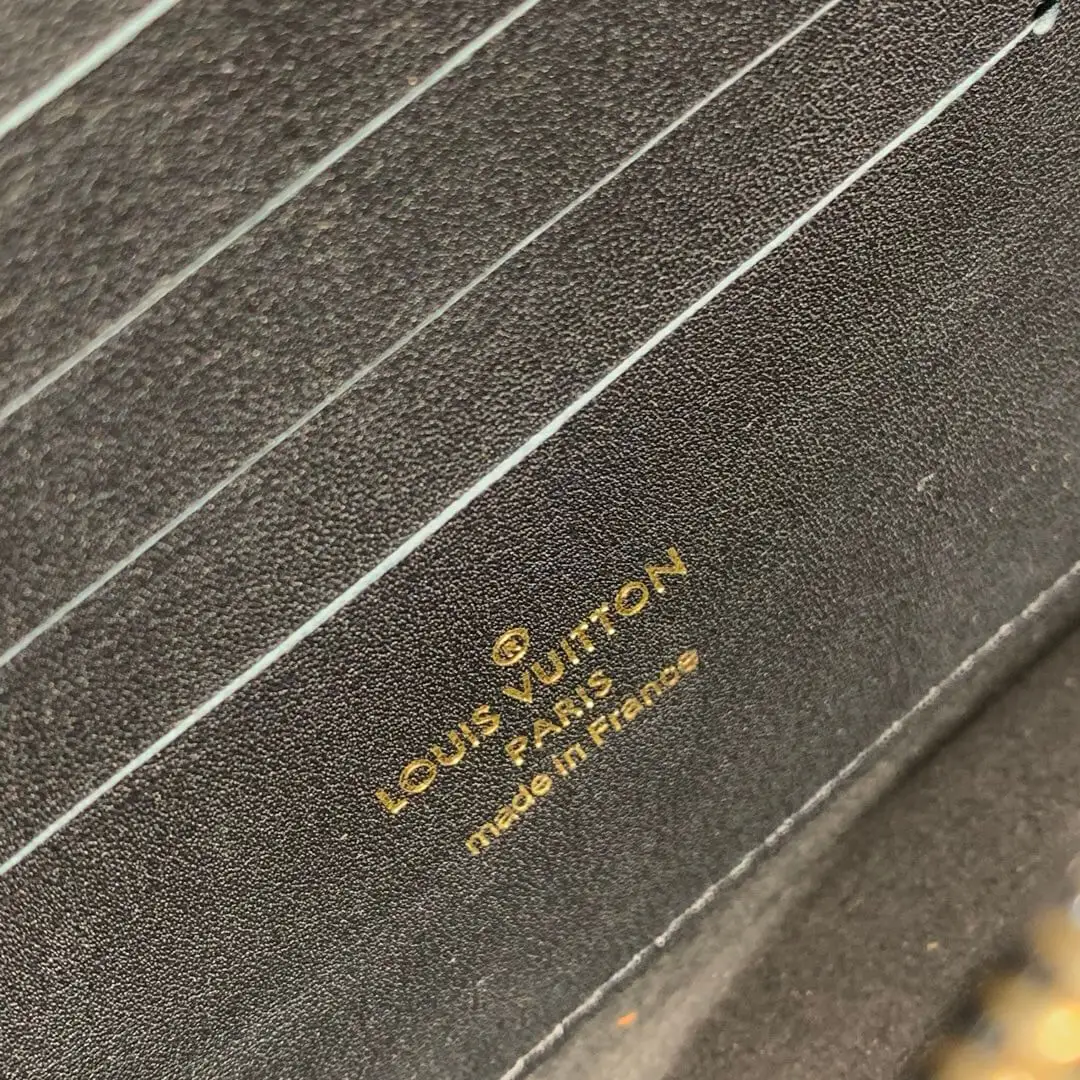 Experience timeless style with this beautifully crafted chain wallet, designed with a vintage-inspired aesthetic. Made from a durable two-tone coated canvas featuring a classic monogram pattern, this piece is elegantly accented with smooth calf-leather trim. Its structured silhouette and polished hardware offer a sophisticated look suitable for any occasion.