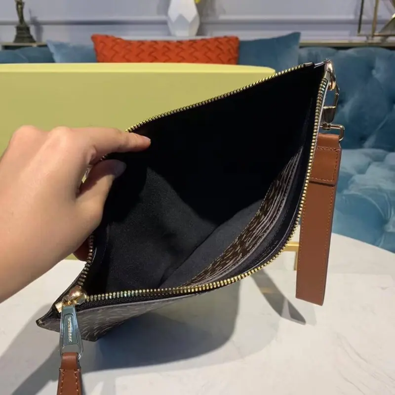 Discover a slim, sophisticated pouch designed for modern life. This piece is crafted from a unique, environmentally conscious canvas, which is primarily made using renewable resources that require less water and generate less CO2 than conventional coated canvases. The exterior features a distinctive, all-over monogram stripe print, elegantly finished with smooth leather trim for a refined touch.