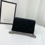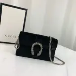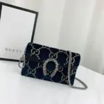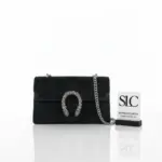 This bag’s compact yet functional silhouette is finished with lustrous palladium-toned hardware, including a delicate chain strap that allows for versatile wear. An ornate feline head clasp provides a secure closure and a touch of opulence, making this accessory a standout choice for any special occasion.