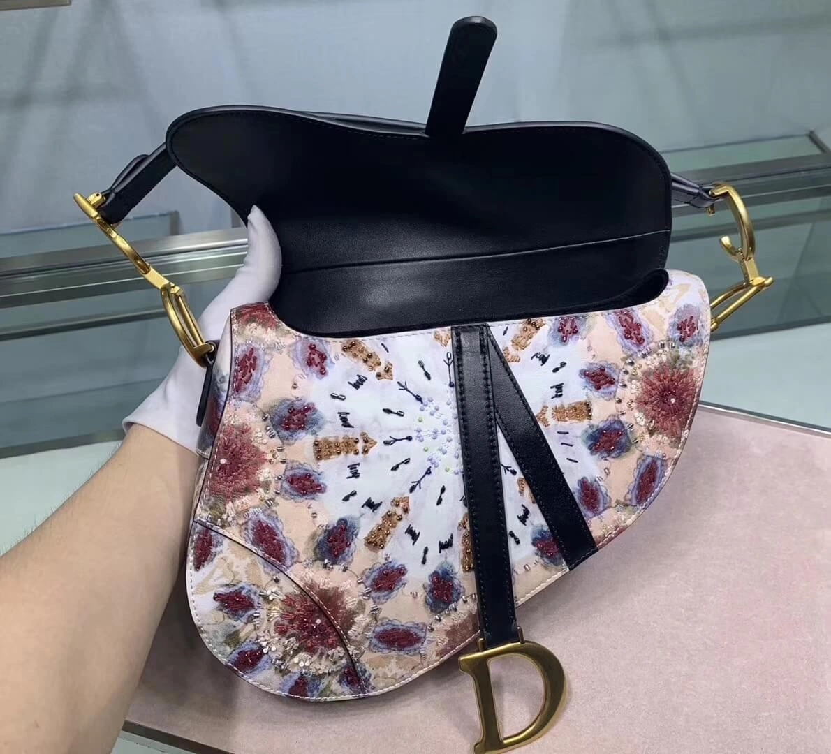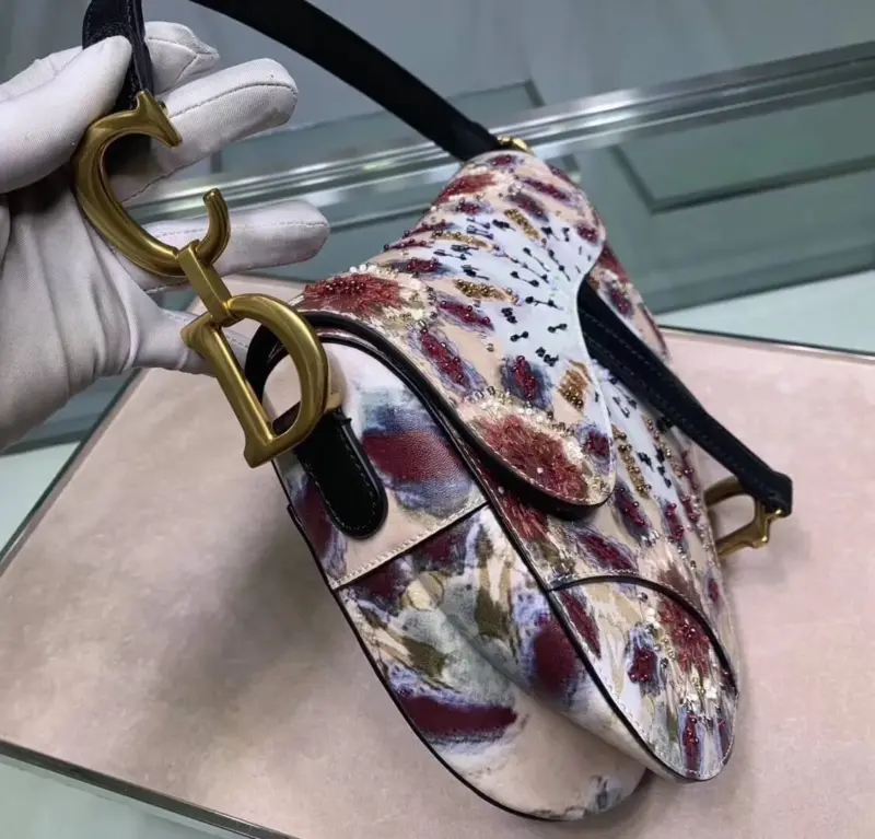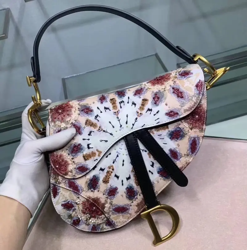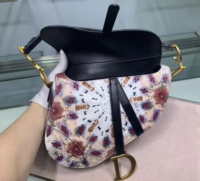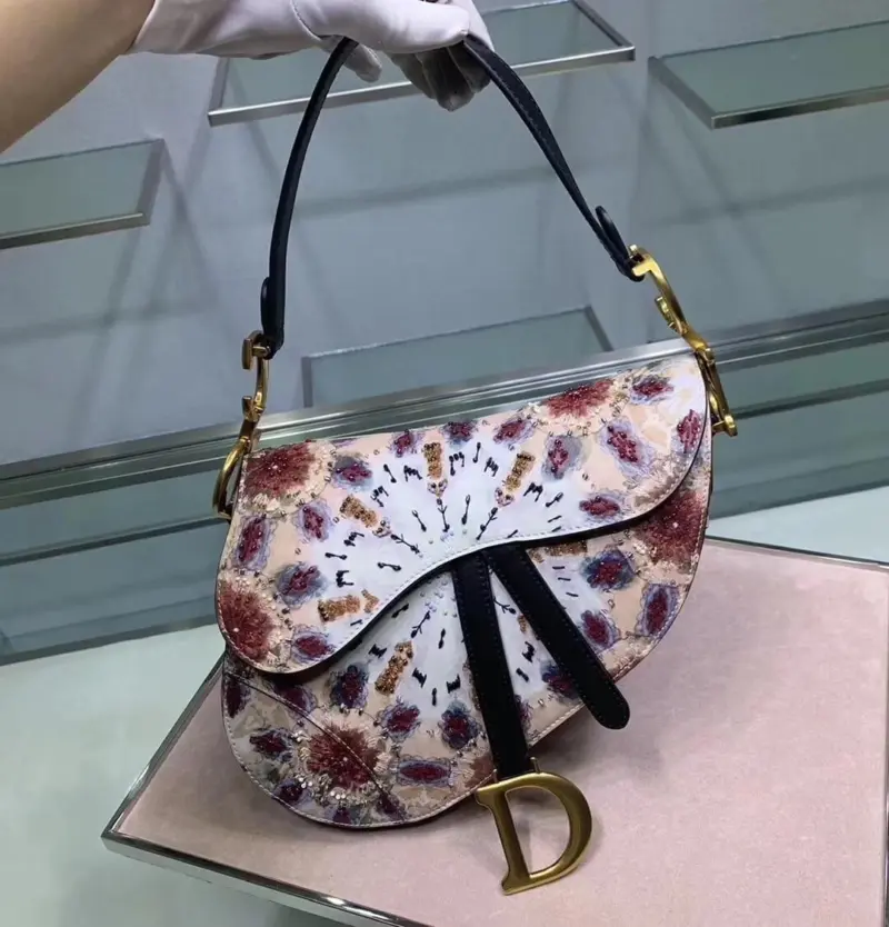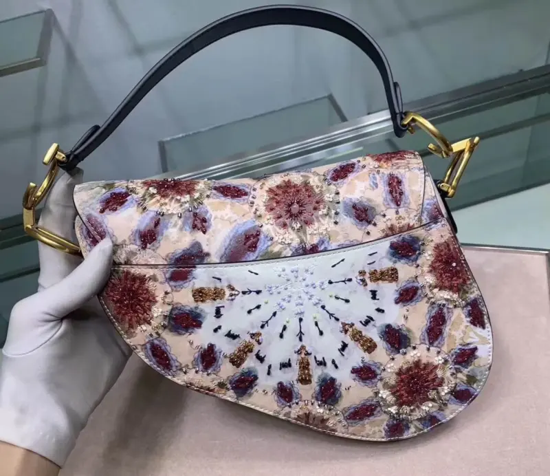 Elevate your accessory collection with this artfully designed shoulder bag, showcasing a distinctive equestrian-inspired silhouette. Crafted from smooth calfskin, the bag serves as a perfect canvas for a stunning, kaleidoscope-themed pattern realized in vibrant print and intricate embroidery. The unique, asymmetrical design and rich detailing make it a standout piece for any occasion.