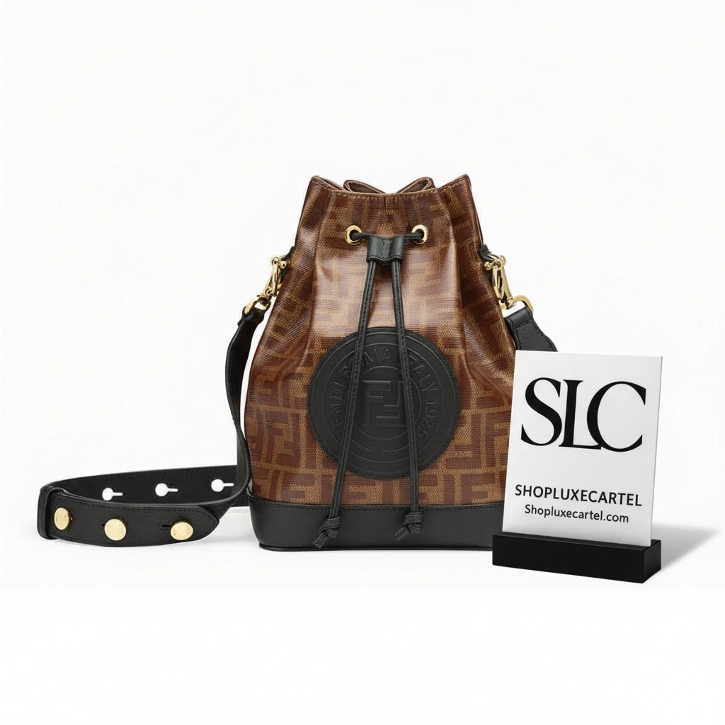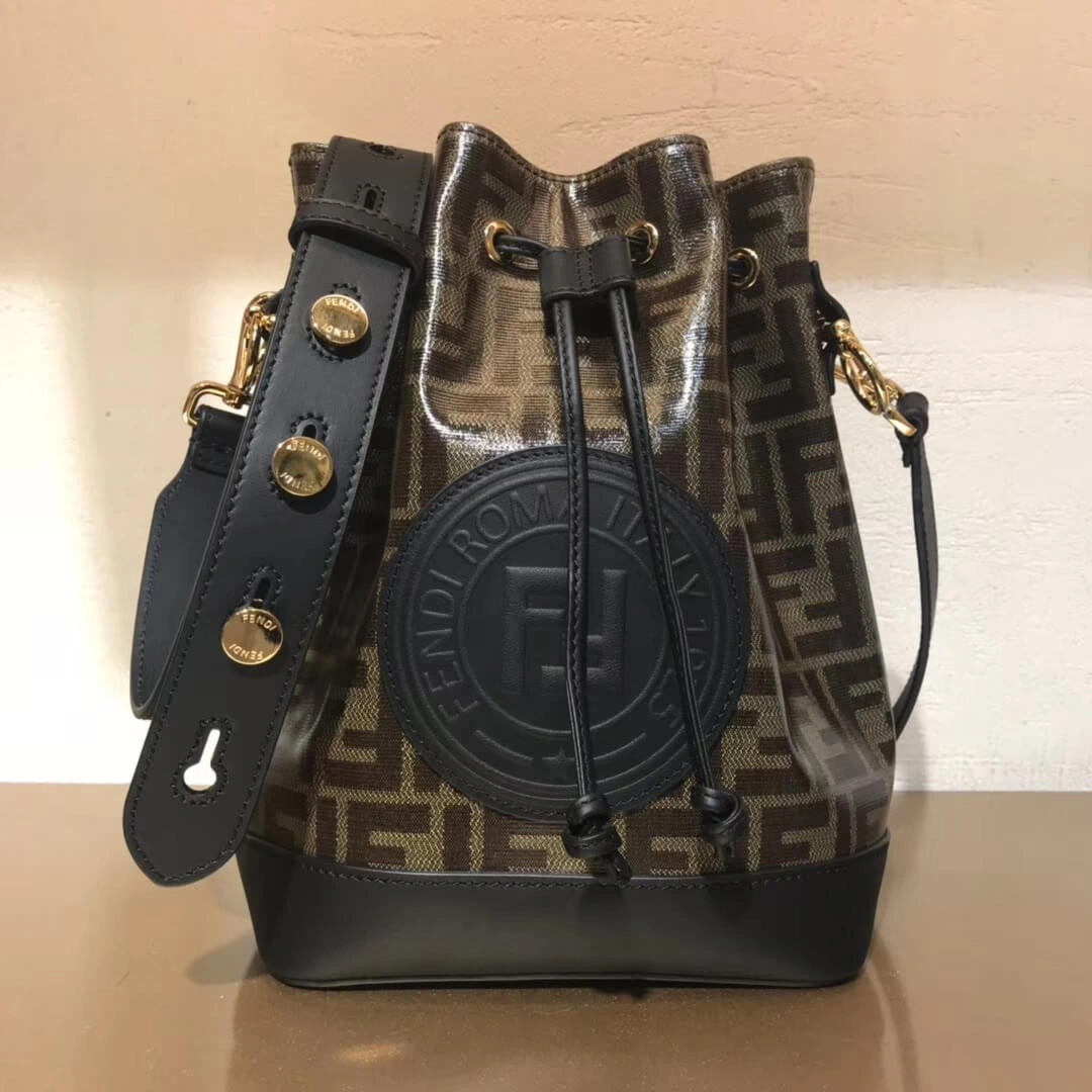 This chic mini bucket bag offers a perfect blend of classic style and everyday functionality. Crafted from a durable glazed canvas, it showcases a sophisticated geometric print in neutral beige and brown, complemented by elegant brown leather details. The secure drawstring fastening and distinctive hardware accents add a polished touch to its timeless bucket silhouette.