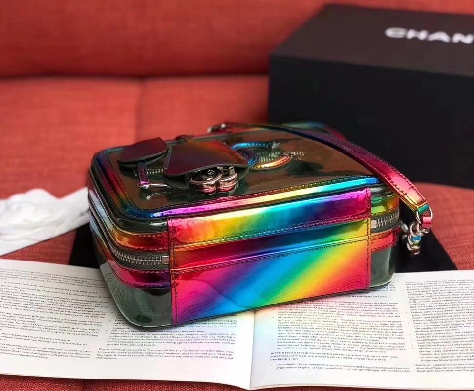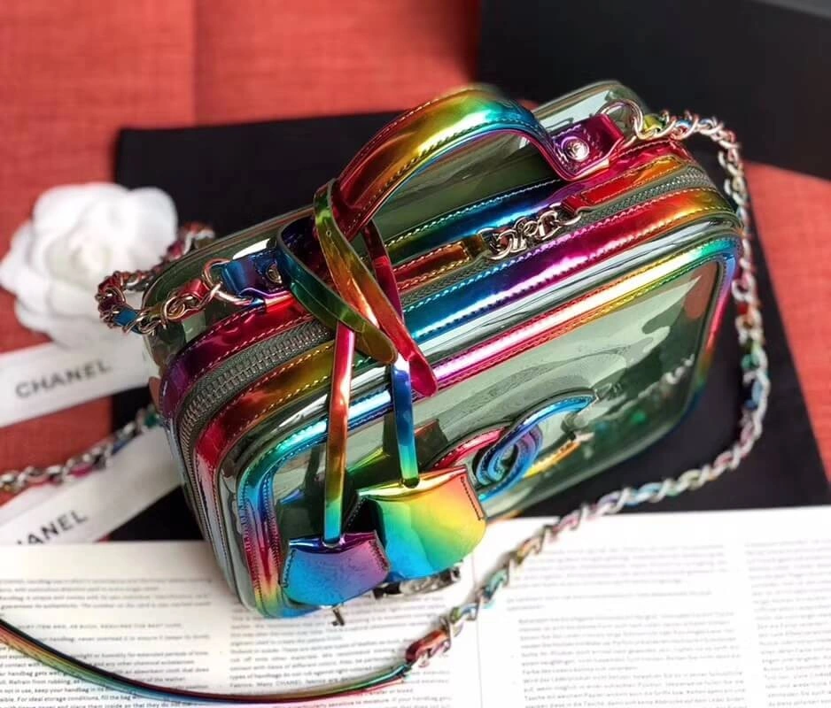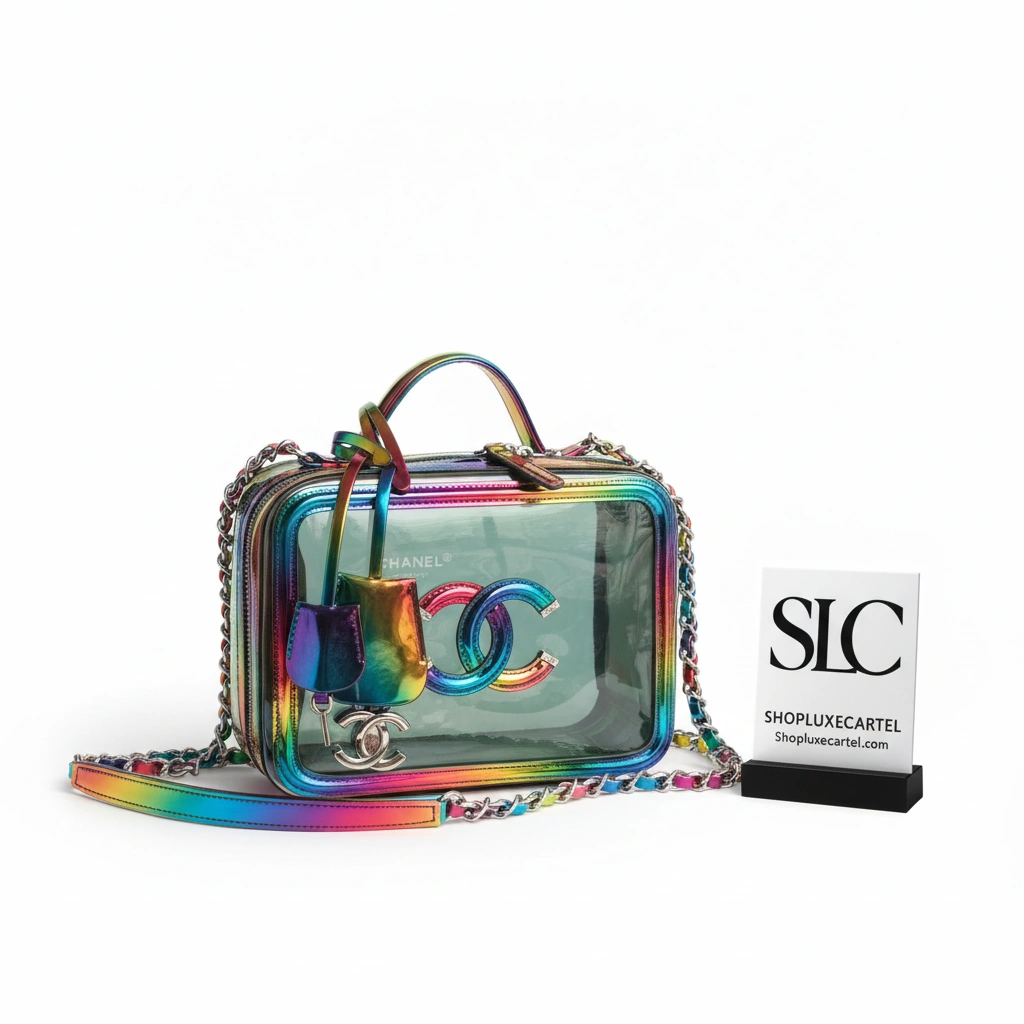This vibrant vanity case offers a contemporary take on a timeless design, crafted from durable and eye-catching multicolour PVC. Its structured shape and convenient top handle make it a perfect accessory for both everyday use and special occasions, adding a playful pop of colour to any ensemble.