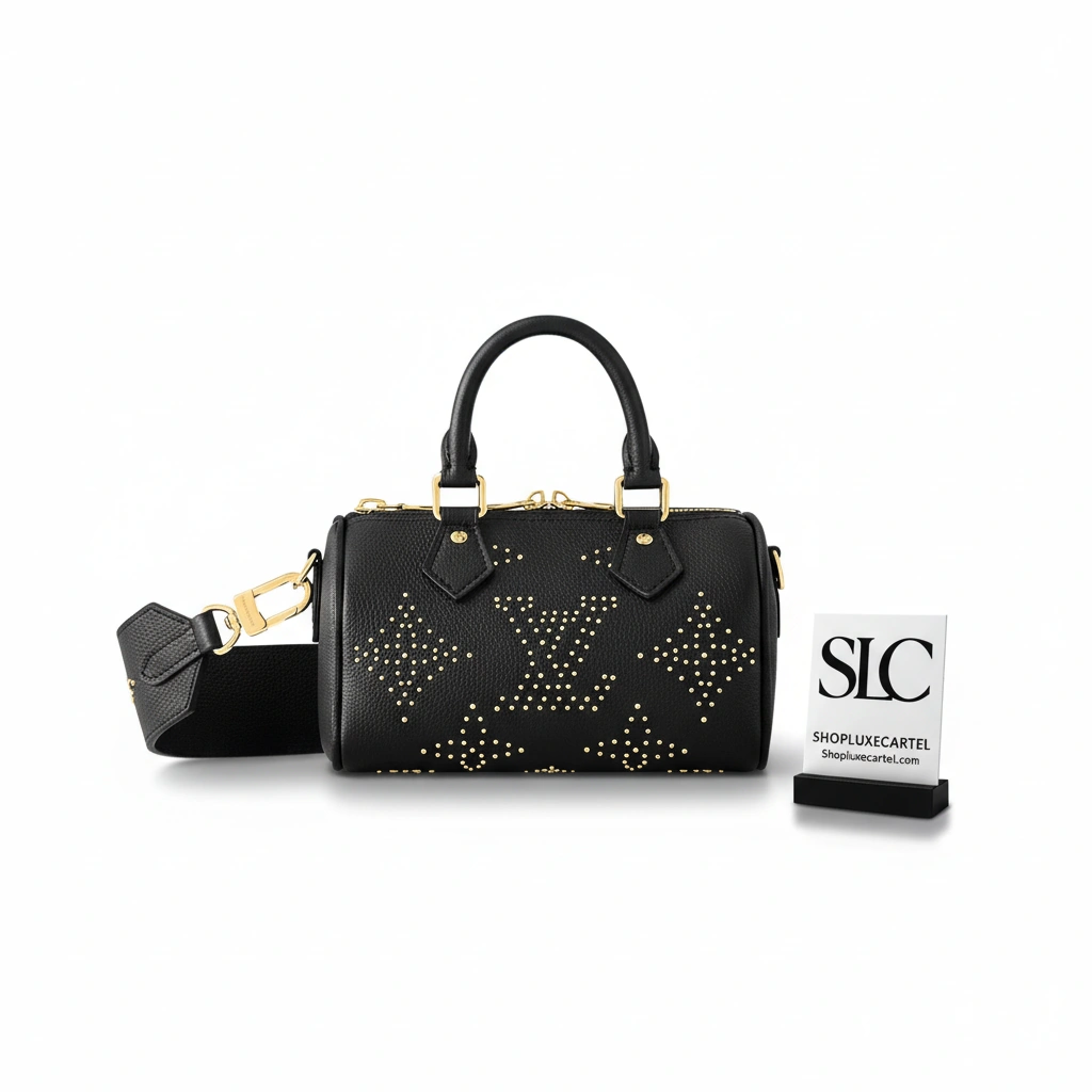 - Gold-tone hardware and stud detailing