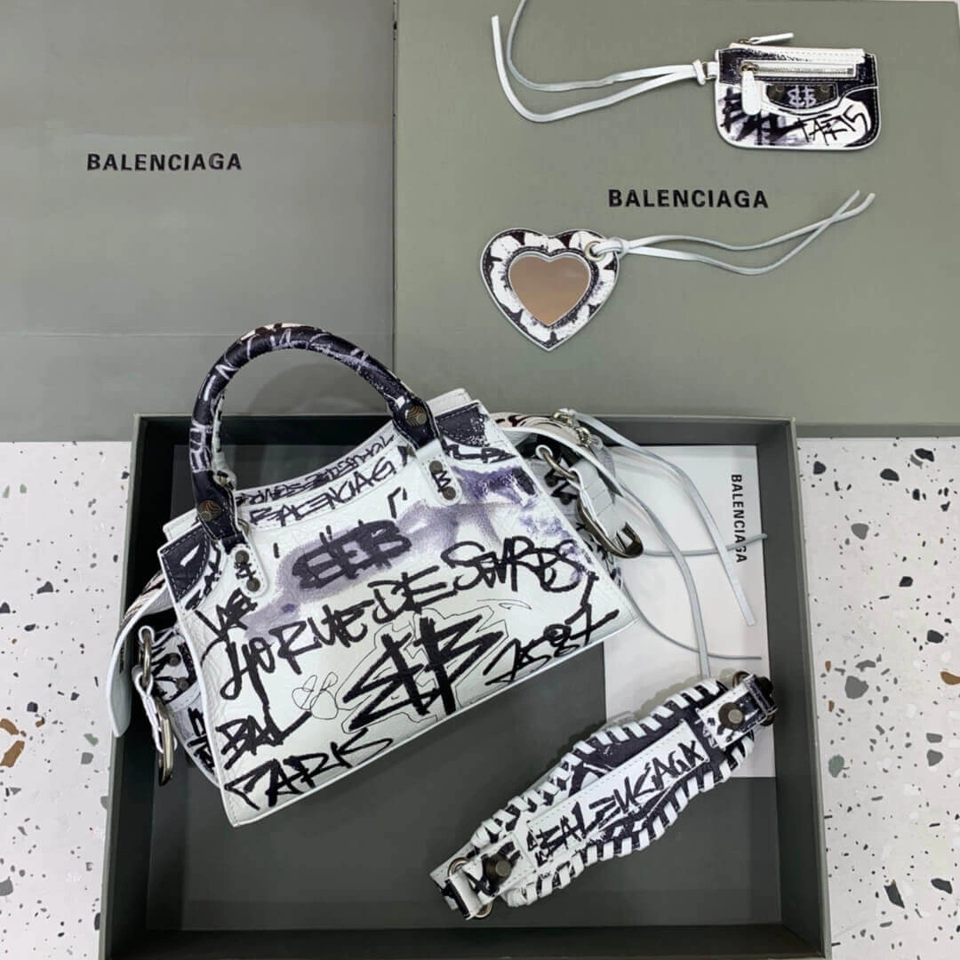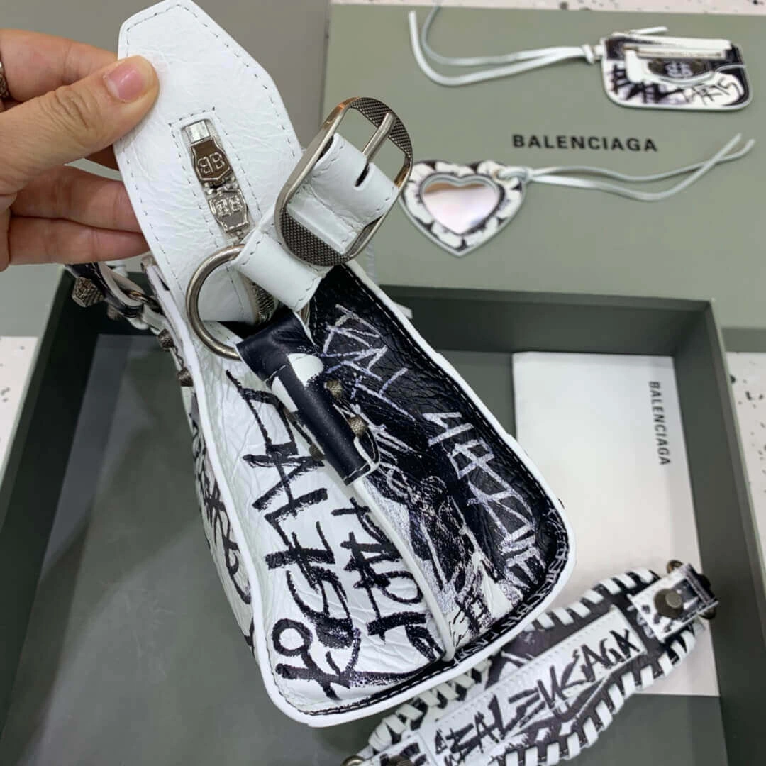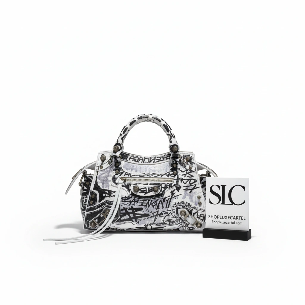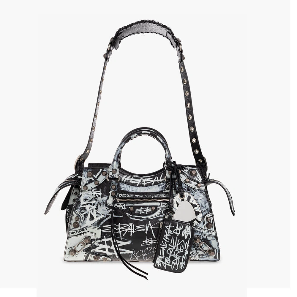 Showcasing an iconic silhouette with a contemporary, rebellious edge, this tote bag is a true statement piece. It is expertly crafted from luxuriously soft, crinkled lambskin, enlivened by a bold black and white graffiti print. The design is punctuated with aged-silver hardware and distinctive stud details, adding a touch of moto-inspired flair to its structured trapezoidal shape. Offering exceptional versatility, it features two intricately hand-braided top handles and a detachable, adjustable shoulder strap for multiple carrying options.