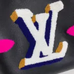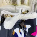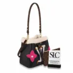 Experience a blend of classic design and cozy, aviation-inspired style with this distinctive bucket bag. Crafted from supple grained leather, it features plush, oversized floral and initial-style motifs created from multi-colored shearling, offering a unique textural contrast. This eye-catching bag makes a sophisticated statement while remaining lightweight and comfortable for daily use.