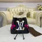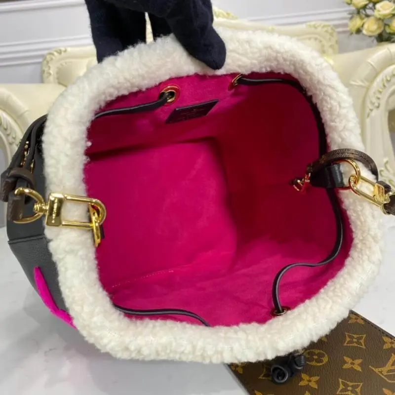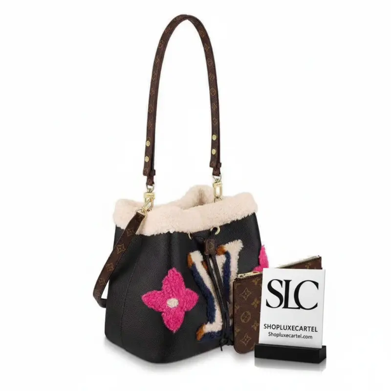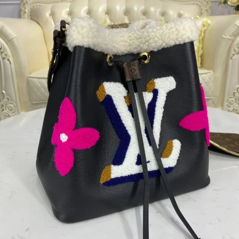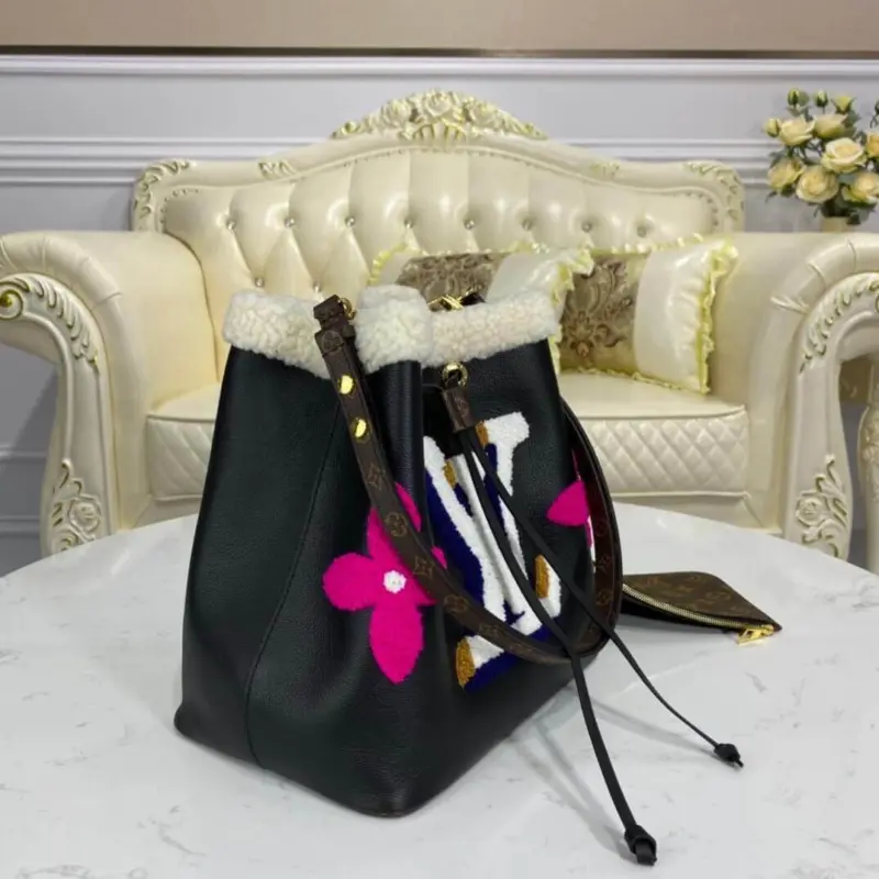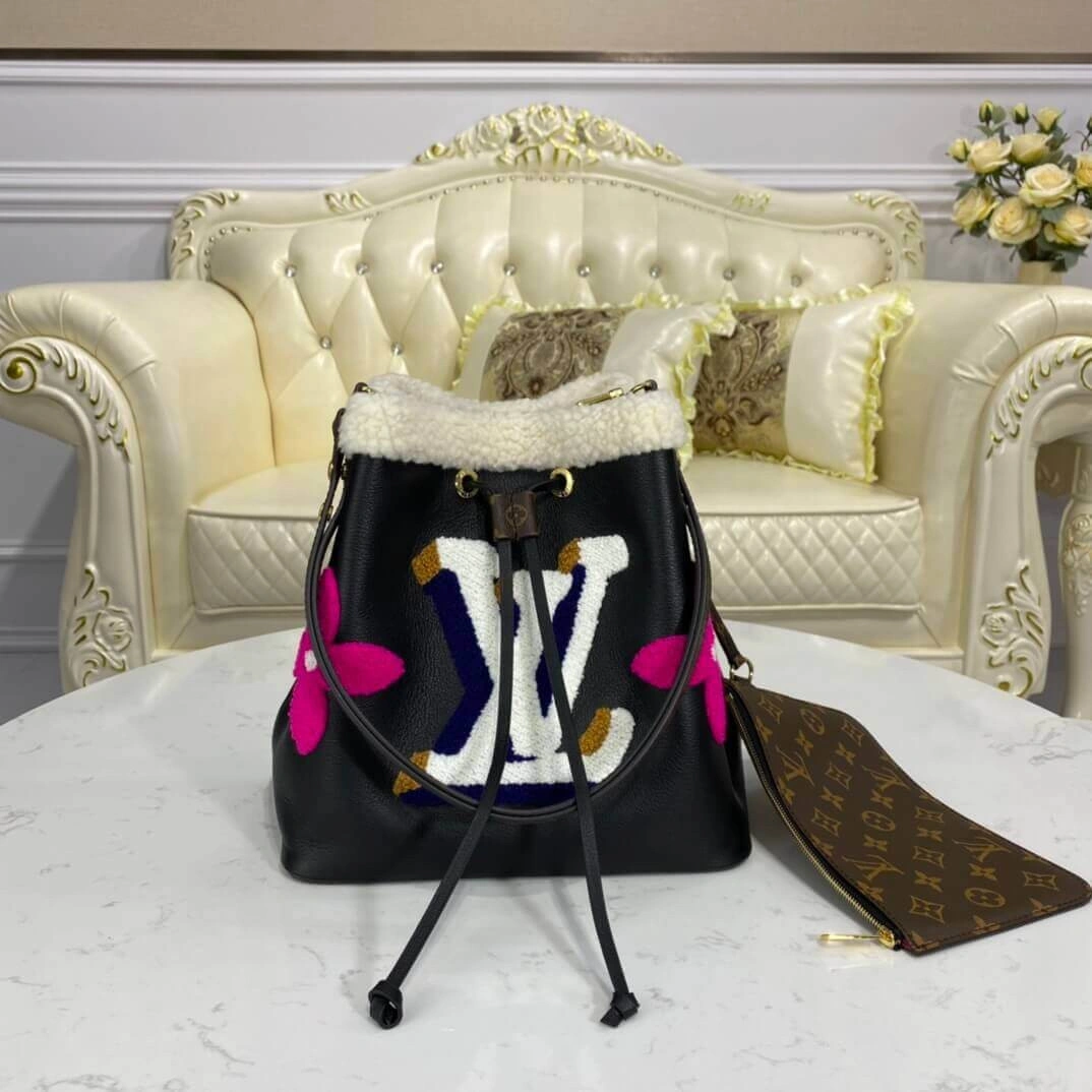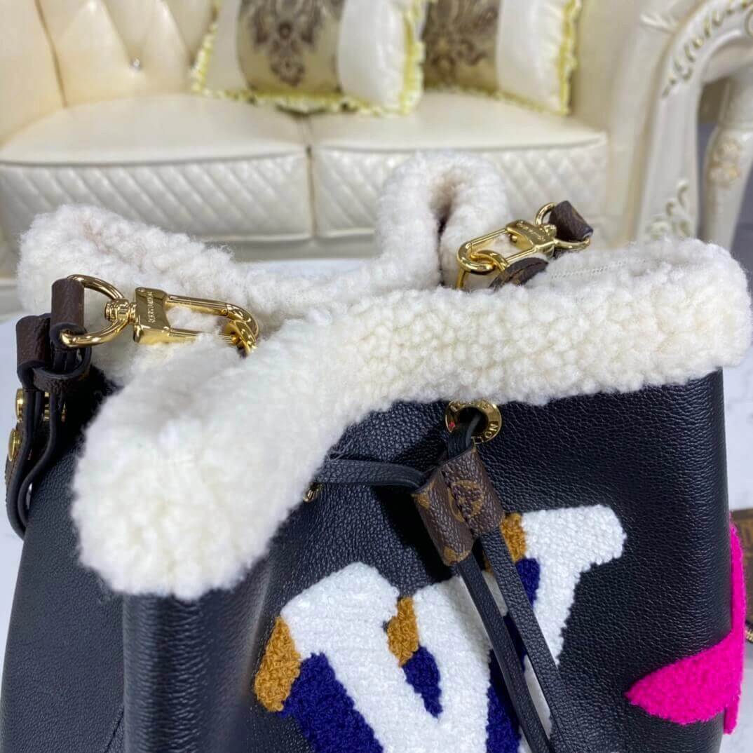 Neonoe MM Drawstring Bucket Bag in Leather and Shearling M56963