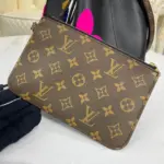 The bag’s versatile design includes a removable and adjustable strap, allowing you to switch between a shoulder and a cross-body carry with ease. Its well-organized interior, secured by a classic drawstring closure, features two main compartments and a central zipped pocket to keep your essentials neatly arranged.