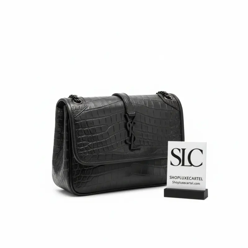 Discover a timeless accessory in this beautifully structured shoulder bag, defined by its classic front-flap design and luxurious texture. Crafted from soft, crocodile-embossed calfskin leather, this piece exudes sophistication, complemented by chic matte black metal hardware. The versatile chain and leather strap can be worn long for crossbody convenience or doubled up for an elegant shoulder carry, adapting effortlessly to any occasion.