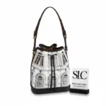 This sophisticated bucket bag offers a unique fusion of classic structure and artistic flair. Crafted from smooth matte calf leather, its surface serves as a canvas for intricate, architectural-inspired drawings of imaginary buildings. A durable, coated-canvas trim featuring a timeless geometric pattern provides a striking graphic frame, enhancing the bag’s elegant profile and making it a standout piece.