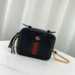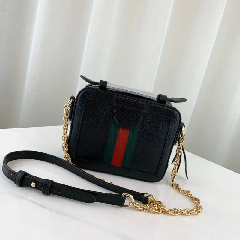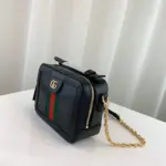 This beautifully designed mini shoulder bag features a classic dome shape crafted from high-quality textured leather. A distinctive green and red stripe detail provides a timeless, elegant accent that complements the bag’s sophisticated silhouette. The design is completed with polished gold-toned hardware, including a striking double-letter emblem at the front for a touch of refined style.