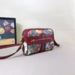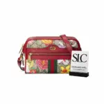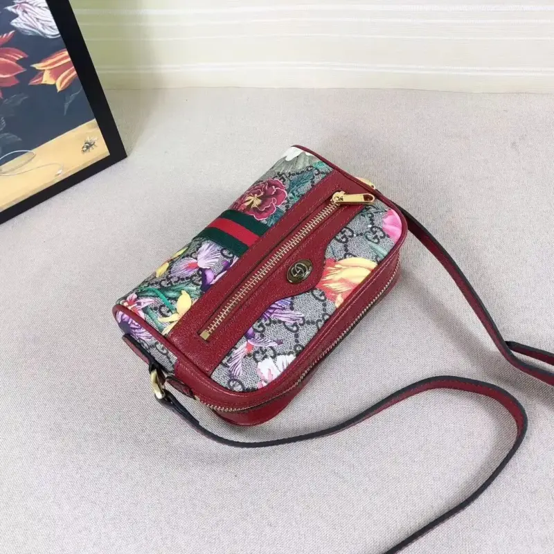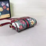 This exquisite mini shoulder bag offers a contemporary fusion of two classic patterns, layering a vibrant, historic floral print over a timeless geometric monogram. Crafted from a durable coated canvas with a low environmental impact, the design is beautifully framed with a rich red leather trim. Its compact silhouette is enhanced by a signature green and red striped webbing detail and elegant, antique-finished hardware, making it a versatile accessory for both day and evening wear.