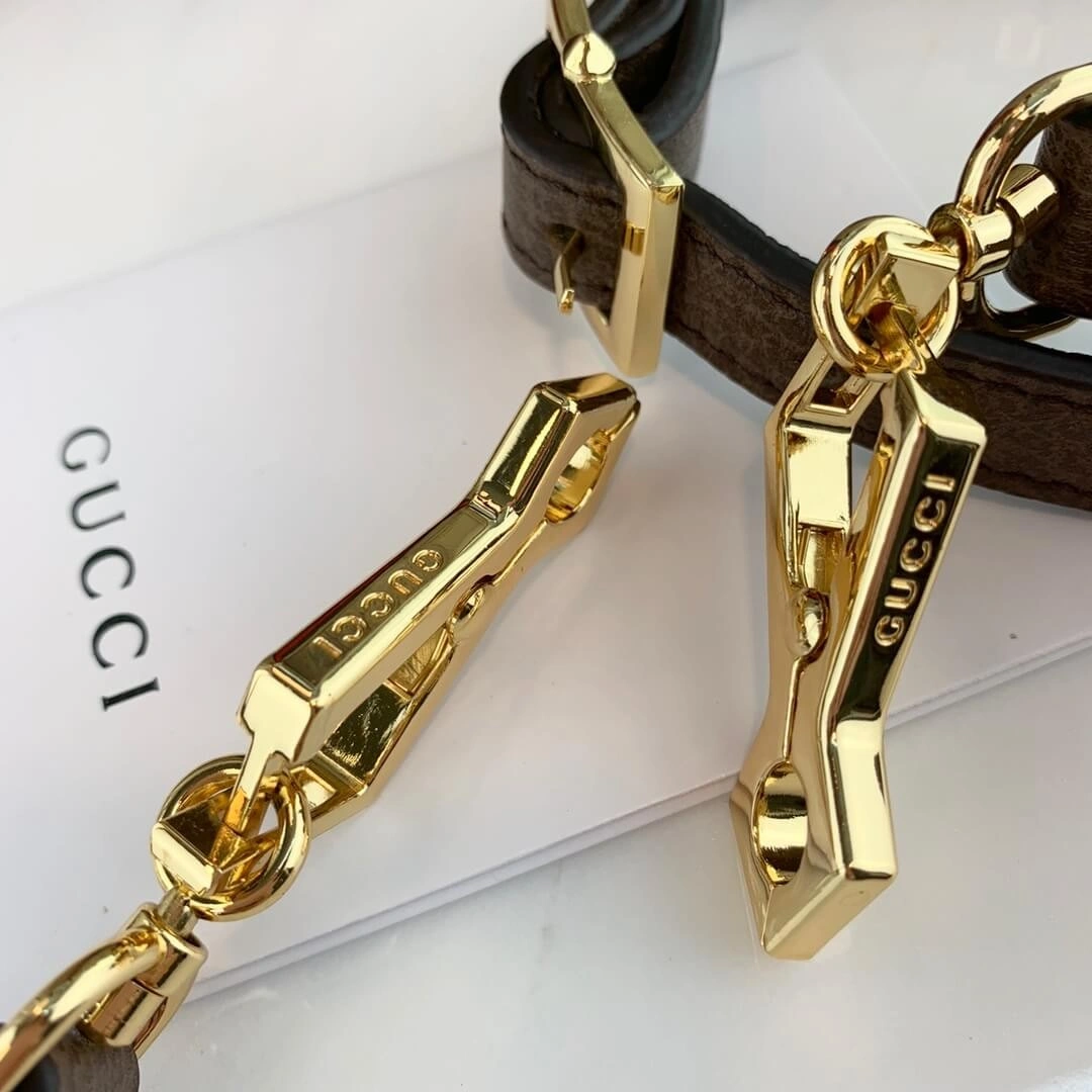 Showcasing a vintage-inspired aesthetic, this medium top handle bag features an elegant, domed shape that recalls classic designs. It is crafted from a durable coated canvas with a geometric monogram print, accented by supple brown leather trim. The bag’s sophisticated look is elevated by a signature green and red stripe detail and gleaming gold-toned hardware, including a distinctive double-letter emblem that adds a touch of timeless charm.