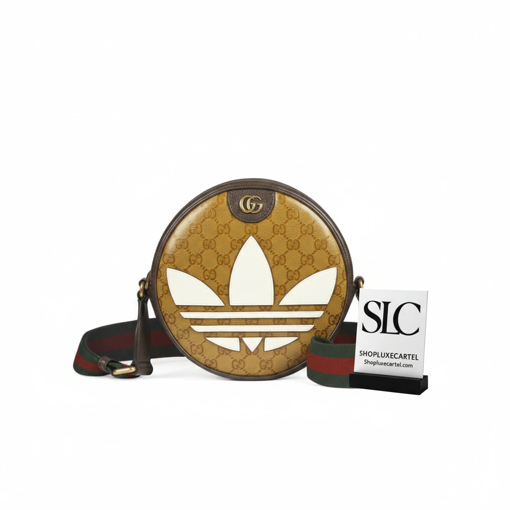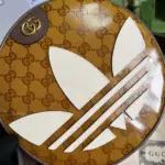 The design is enhanced with distinctive details, including a prominent leather patch showcasing a geometric emblem and a detachable striped webbing shoulder strap for versatile wear. A secure zip closure opens to a well-sized interior, making this piece a perfect fusion of heritage style and practical luxury.