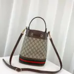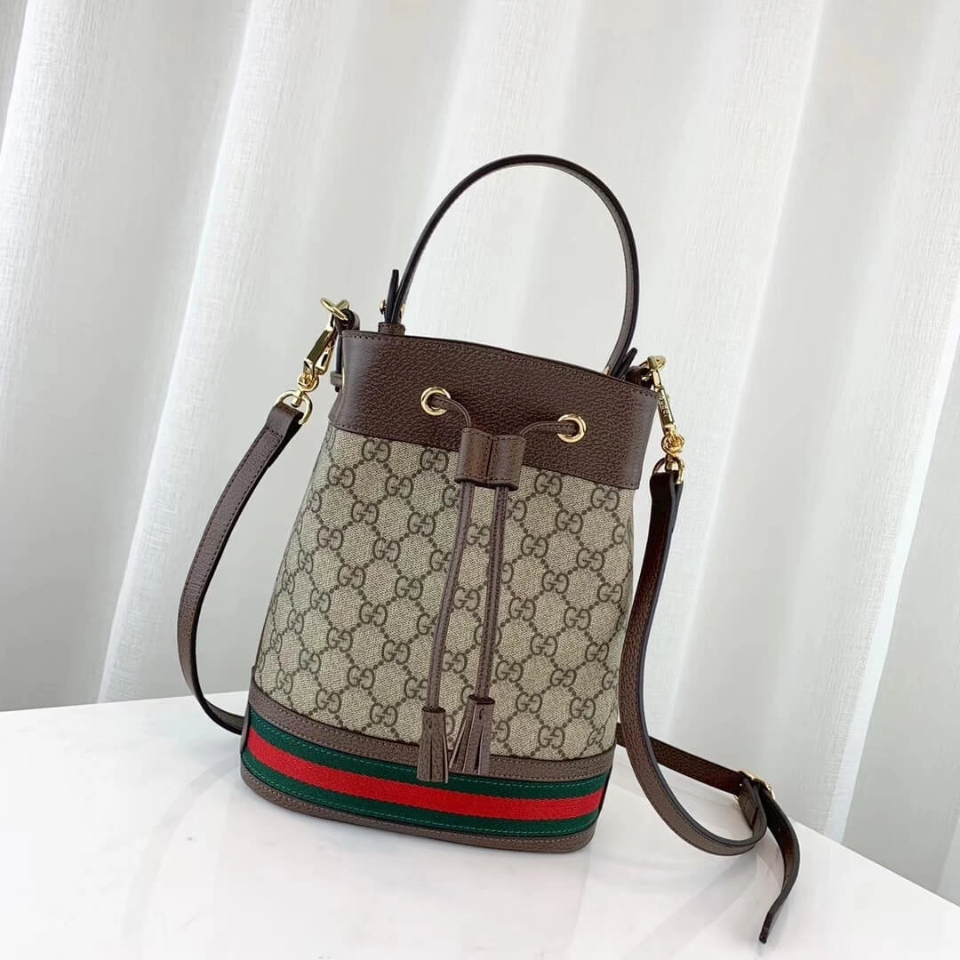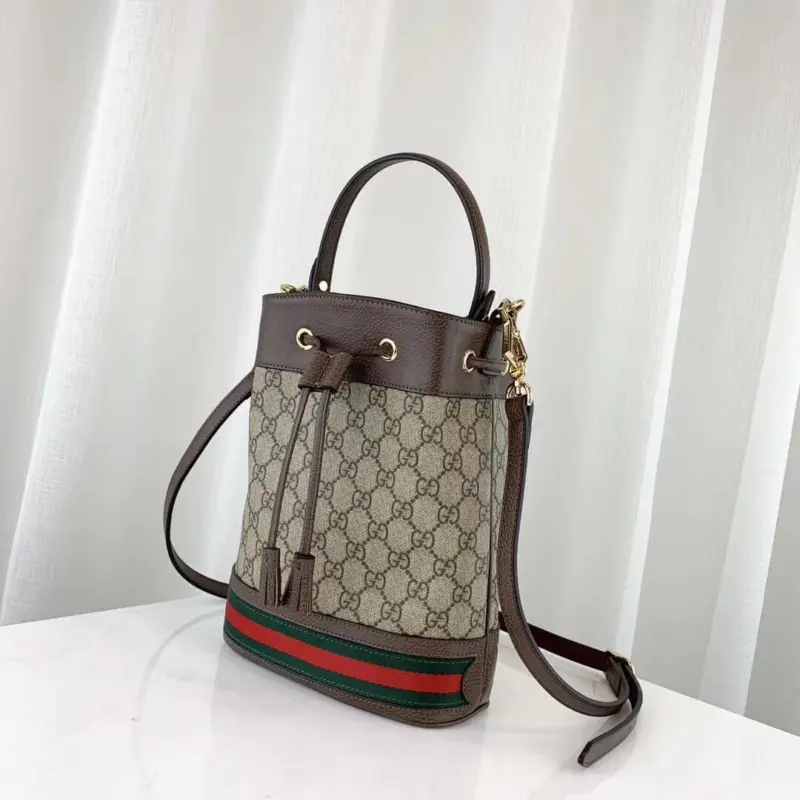 Discover a timeless classic with this beautifully structured bucket bag. Featuring a sophisticated monogram print on durable coated canvas, this piece is accented with rich brown leather trim and a signature green and red stripe detail along the base for a touch of heritage-inspired style. Its versatile design offers multiple carrying options, effortlessly transitioning from a chic top-handle bag to a comfortable crossbody.