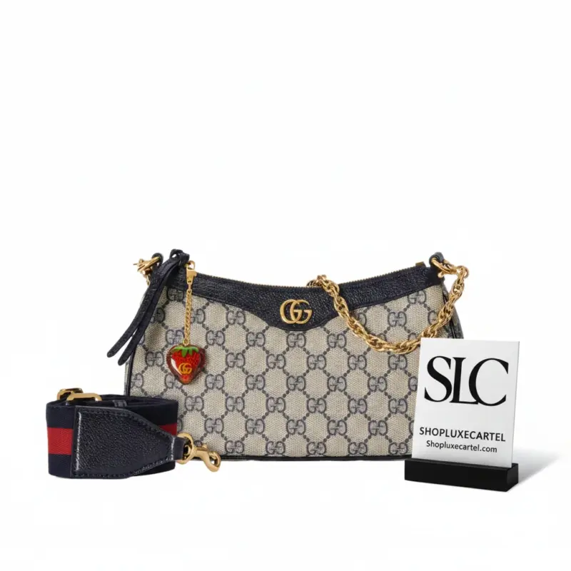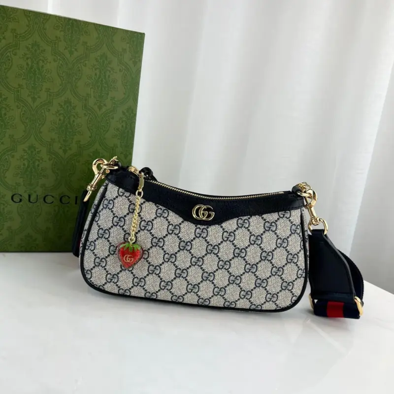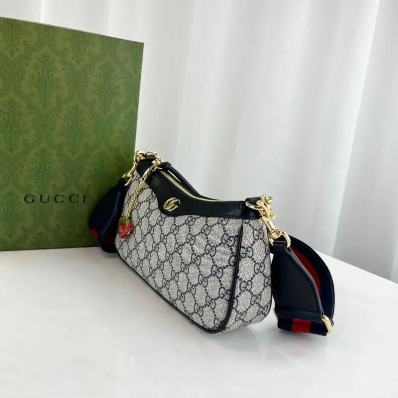 The design is distinguished by a signature striped webbing detail in blue and red, adding a touch of heritage-inspired flair. A polished, interlocking double-G hardware accent on the front provides a recognizable finish. This beautifully crafted piece is completed with a secure top zip closure, blending iconic design elements with practical functionality.