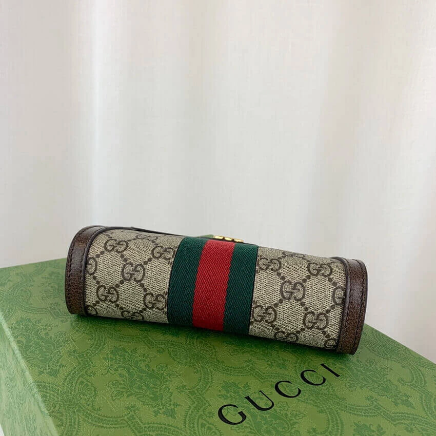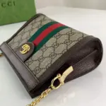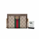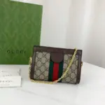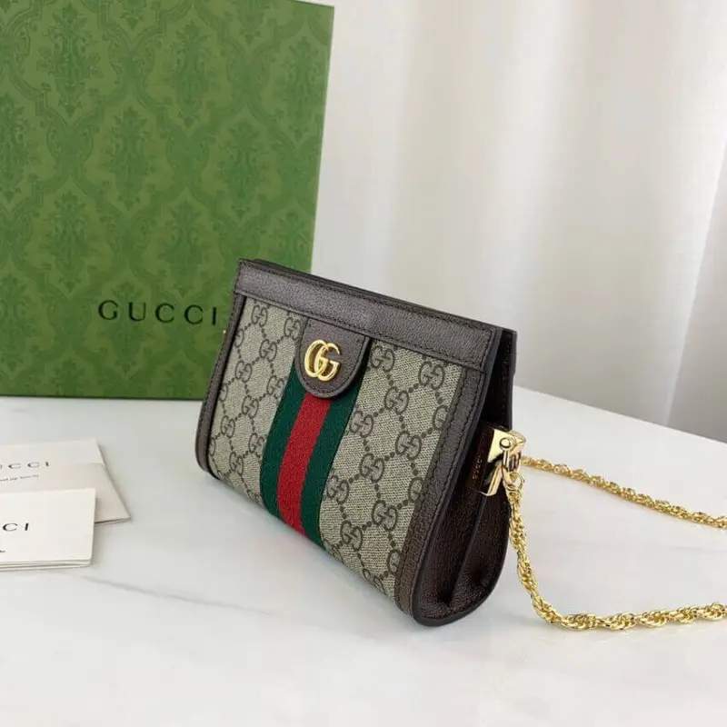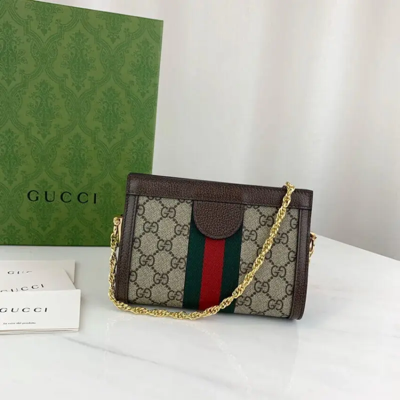 The bag is further enhanced by a signature green and red striped detail and gleaming gold-toned hardware. A slender chain strap completes the look, providing a comfortable and elegant way to carry this sophisticated piece. It’s an ideal choice for bringing a touch of vintage charm to a modern wardrobe.