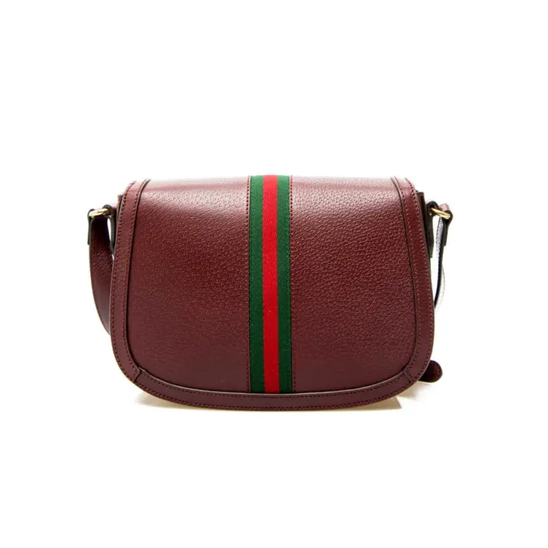 Showcasing a timeless aesthetic, this dome-shaped shoulder bag combines classic design elements with everyday functionality. The bag is crafted from a durable, coated canvas featuring a distinctive geometric pattern, elegantly contrasted with genuine leather trim. A signature green and red striped webbing detail down the center adds a touch of iconic, vintage-inspired style.