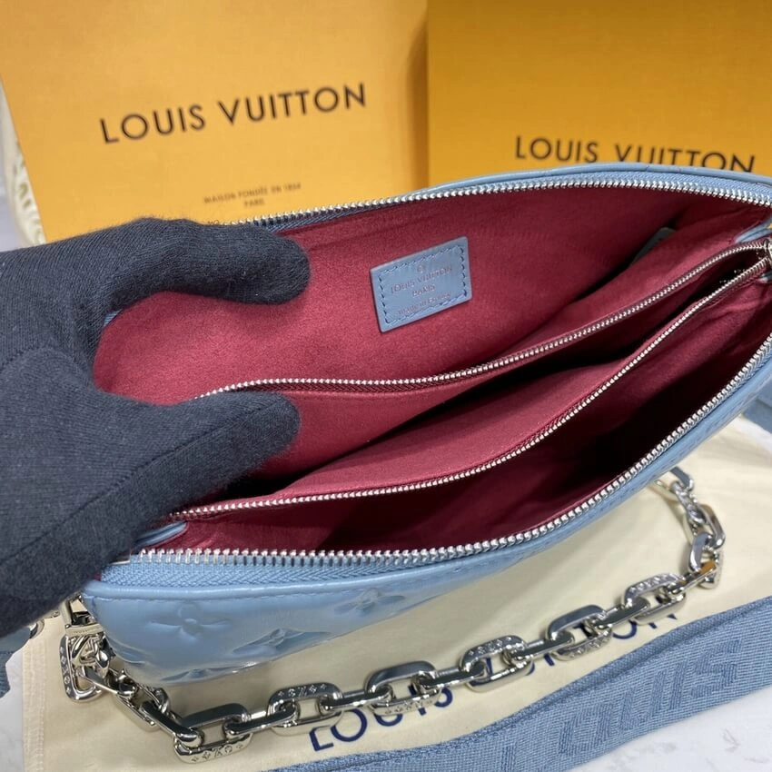 Discover ultimate versatility with this beautifully crafted shoulder bag, fashioned from supple, puffy lambskin in a serene glacier blue. The plush, cushioned design is accentuated by a striking, chunky gold-tone chain, offering a modern and luxurious aesthetic. This adaptable accessory is designed to complement any look, seamlessly transitioning from day to night.