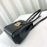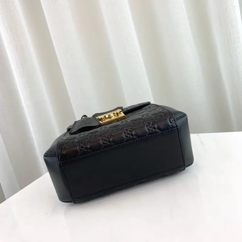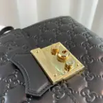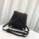 This beautifully structured backpack combines classic design with practical functionality. Its sophisticated dome shape is crafted from high-quality, heat-debossed leather, featuring a firm texture and an intricate all-over print. The bag’s defining feature is a polished padlock closure, which includes a key secured in a chic, detachable leather case.