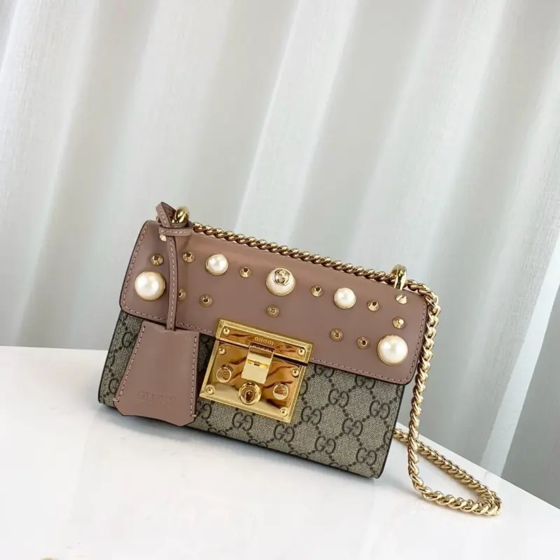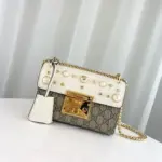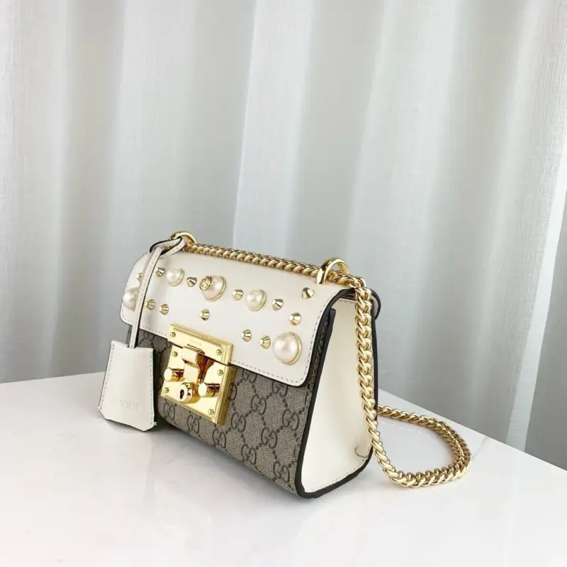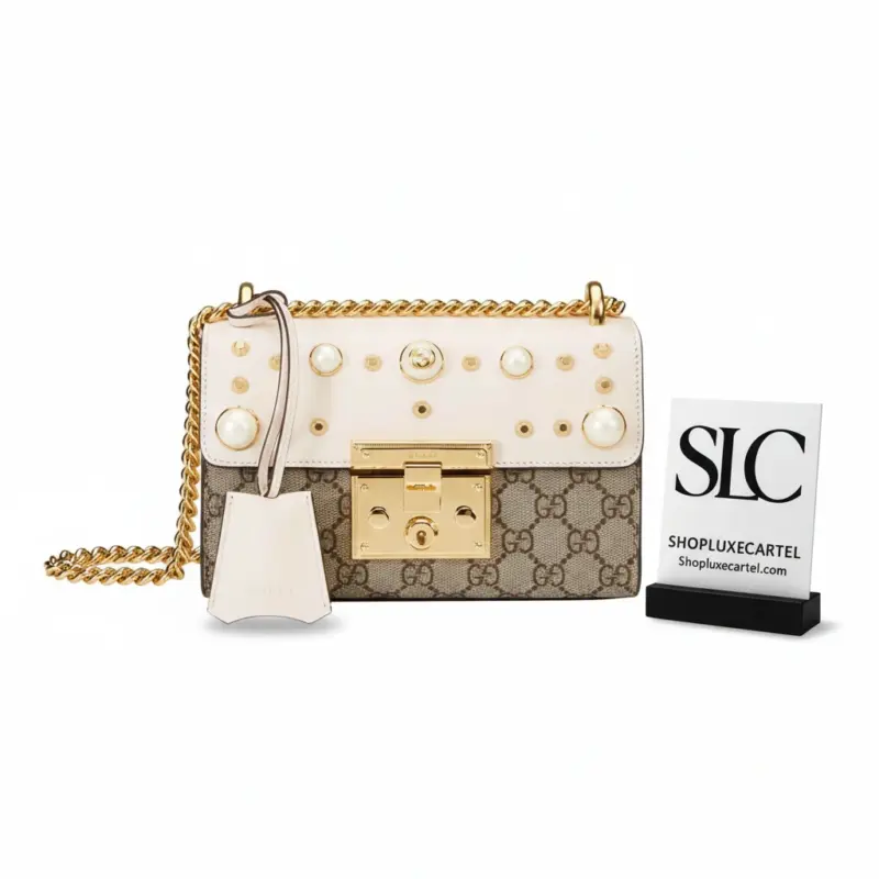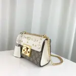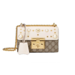 This small, structured chain shoulder bag offers a sophisticated and timeless design, perfect for elevating any outfit. It features a distinctive key lock closure for a touch of vintage-inspired elegance, with the matching key secured in a chic leather holder. The bag’s classic silhouette is enhanced with an arrangement of gold-tone studs and lustrous pearl-style embellishments, adding a modern and luxurious edge.