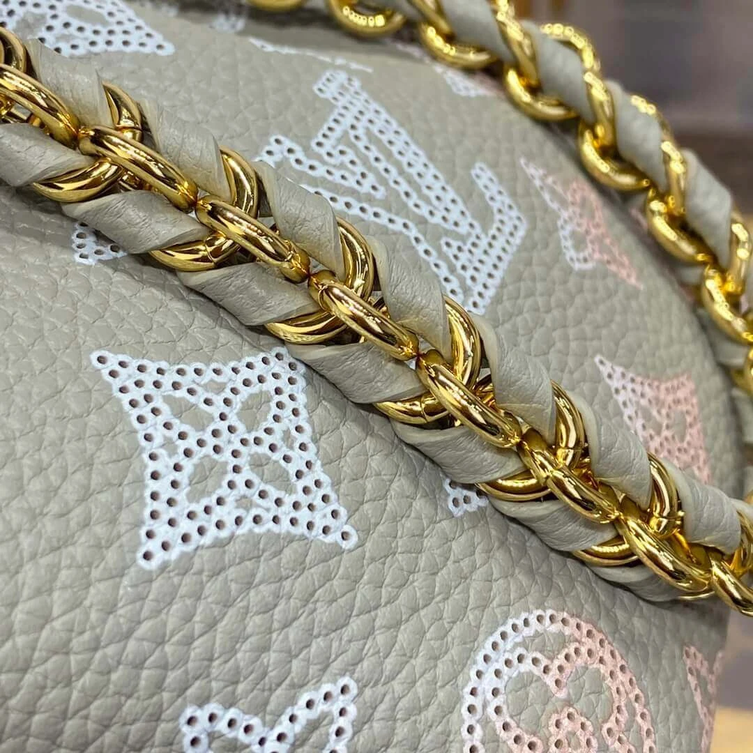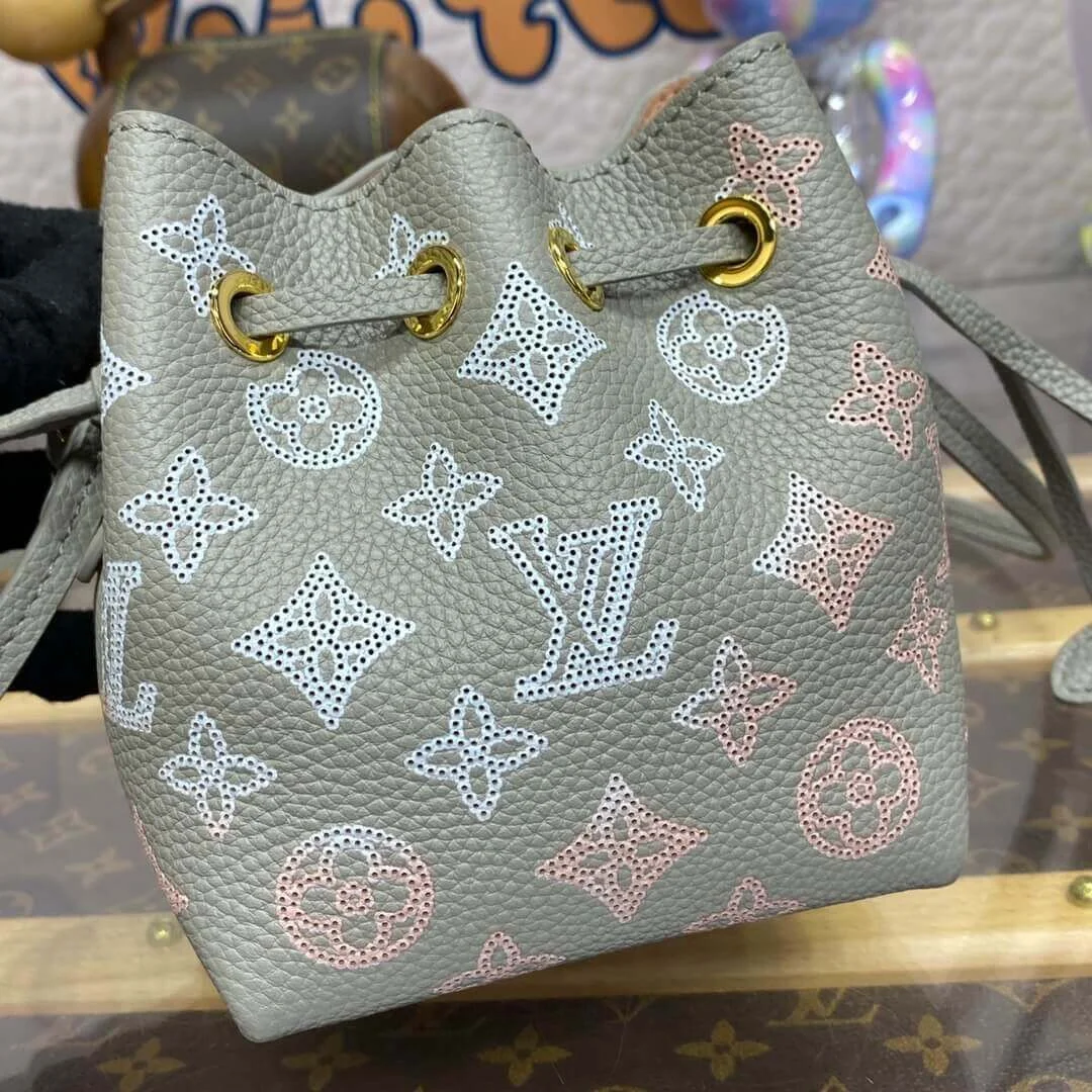 Discover an adorable and compact bucket bag, expertly fashioned from soft, perforated calfskin for a sophisticated and textured feel. The delicate pattern perforated into the leather adds a touch of unique elegance, while the pale-gold-color hardware provides a tastefully luxurious finish. This charming accessory is perfect for adding a refined statement to any outfit.