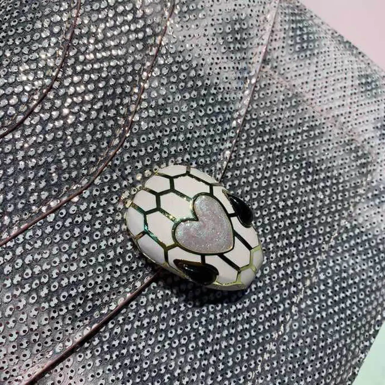 - Closure: Flap cover with a black and white enamel serpent head clasp featuring green stone accents