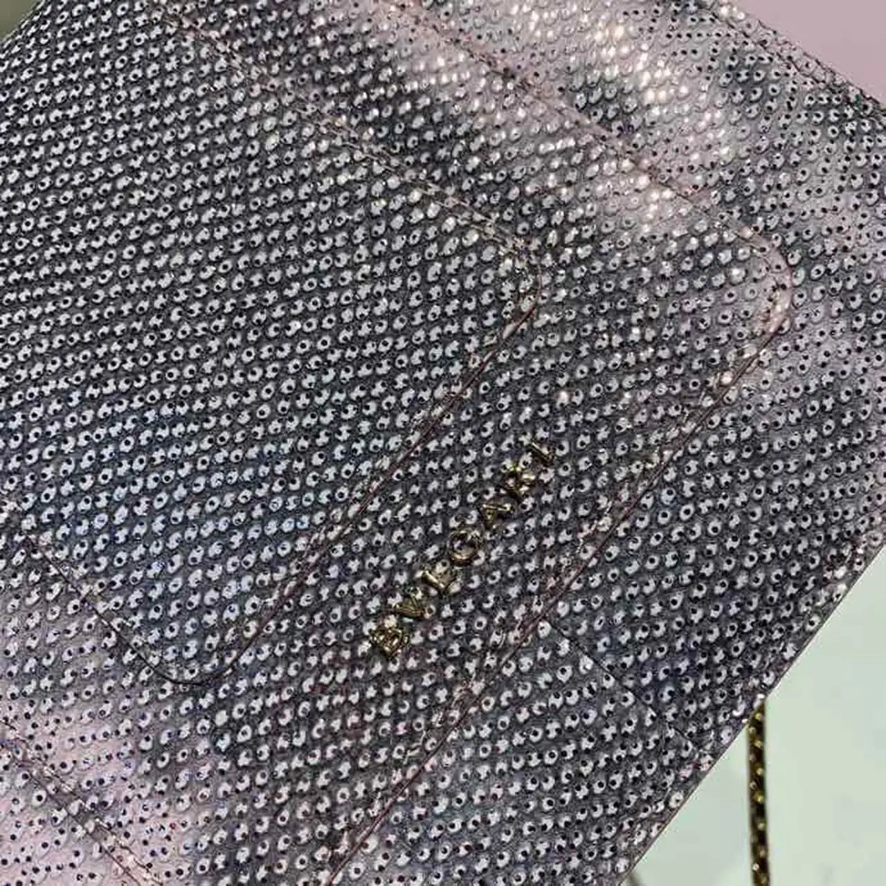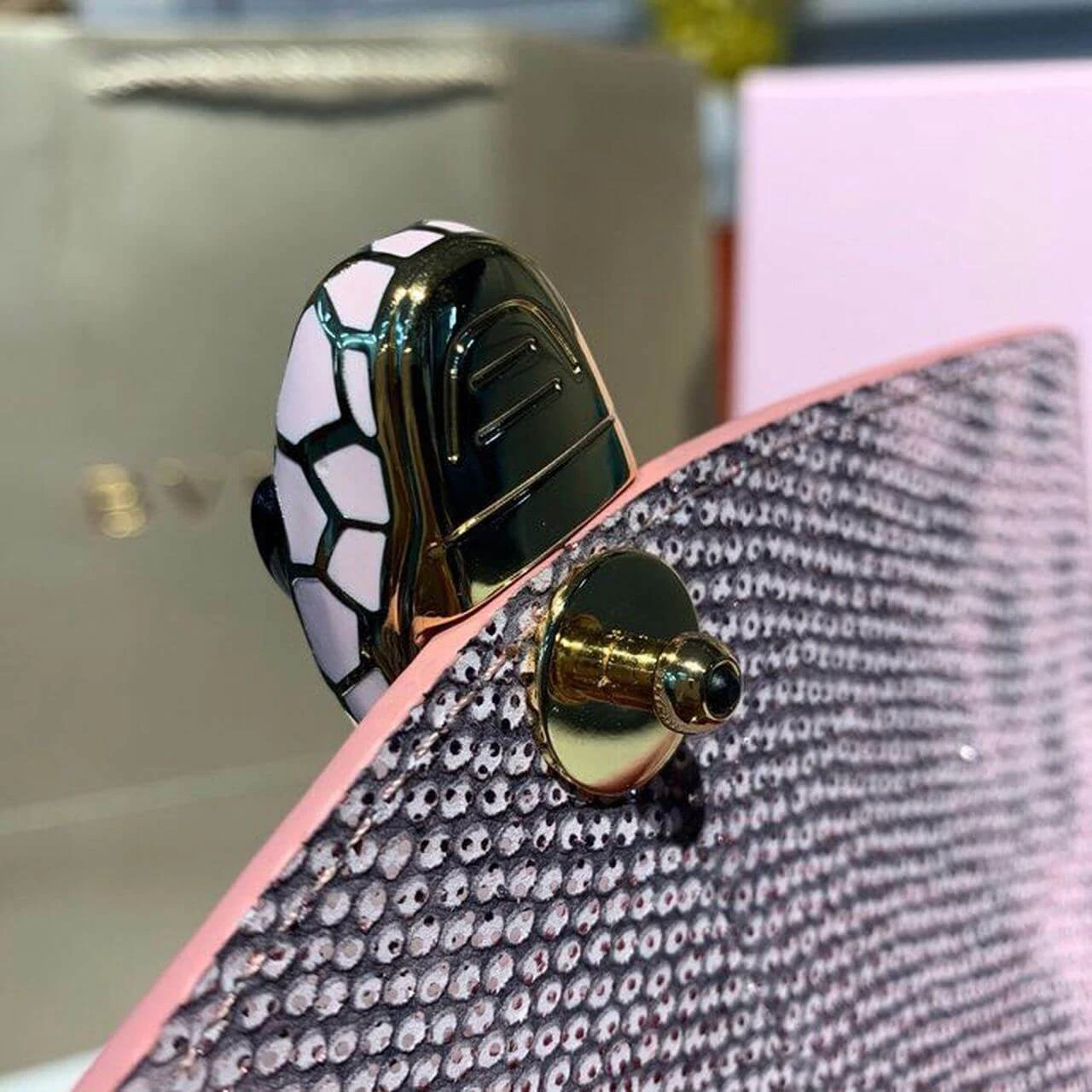 Discover sophisticated style with this exquisitely crafted top handle bag, presented in a luxurious metallic pink karung skin. The bag’s structured and compact silhouette makes it an elegant choice for any occasion, from daytime engagements to evening events. Its most captivating feature is a distinctive serpent head closure, meticulously detailed with black and white enamel and finished with mesmerizing green stone eyes.