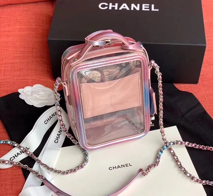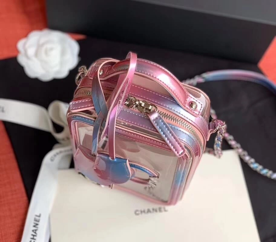 Elevate your travel style with this chic and contemporary vanity case. Designed for the modern globetrotter, its structured silhouette is crafted from a durable, translucent PVC material, showcasing a vibrant multicolour palette with a dominant pink hue. This compact case is perfect for organizing cosmetics and essentials, blending playful aesthetics with practical design.
