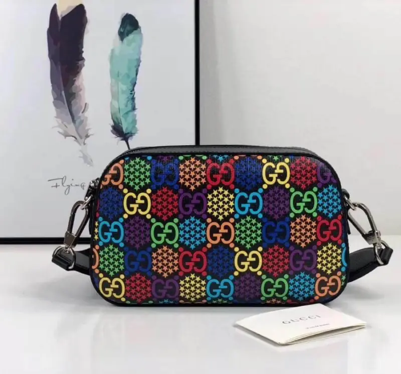 Showcase a bold, contemporary look with this camera-style shoulder bag. It features a striking, all-over geometric monogram print on a durable, soft coated canvas, creating an eye-catching psychedelic effect. The compact and structured design makes it a perfect accessory for both daily activities and special occasions.